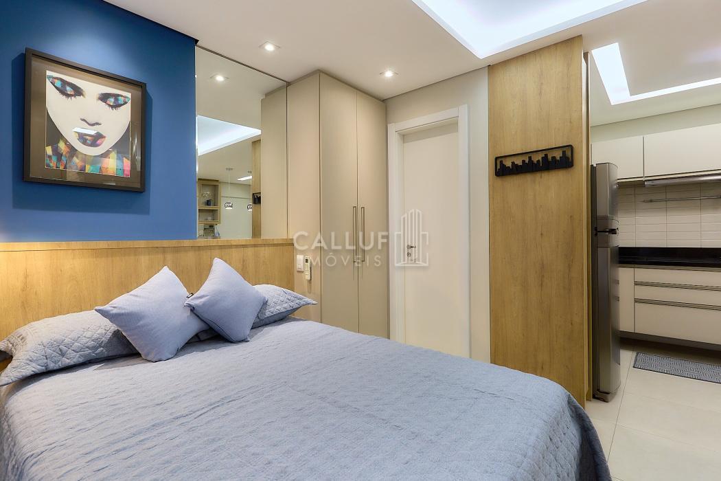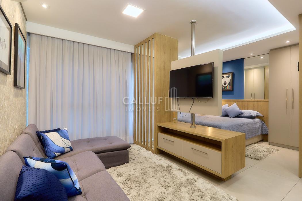 O espaço foi inteligentemente planejado para oferecer integração entre os ambientes, com móveis sob medida, iluminação moderna e uma TV que gira entre a sala e o quarto.