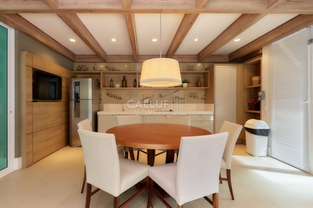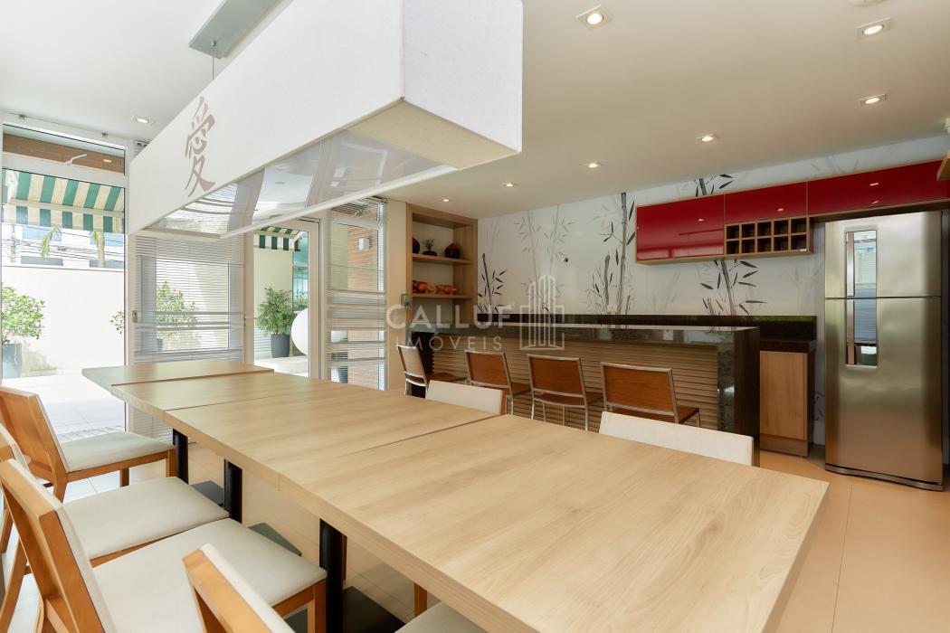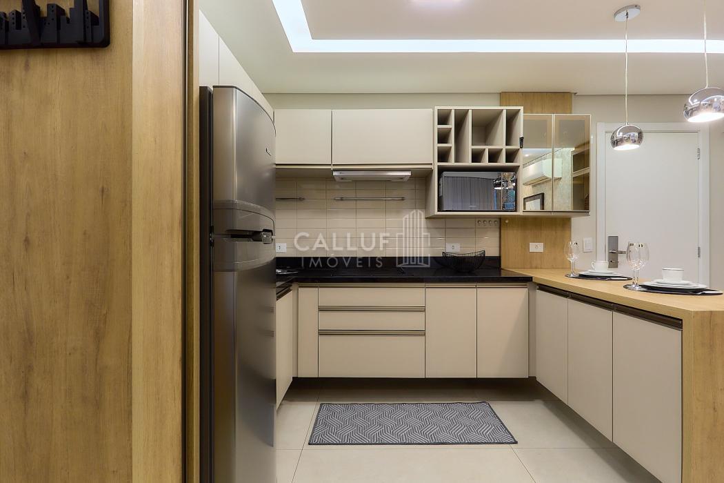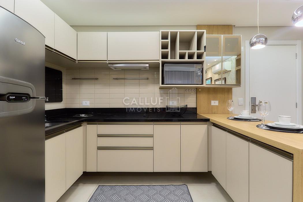A cozinha é completa, com armários, cooktop, coifa, micro-ondas e geladeira.