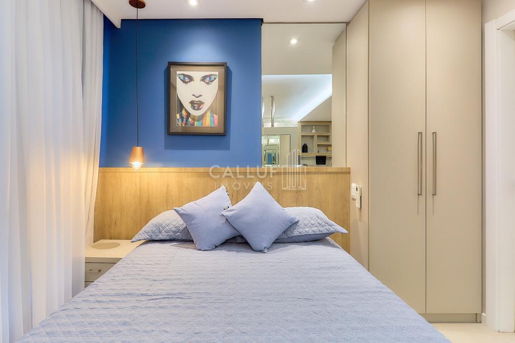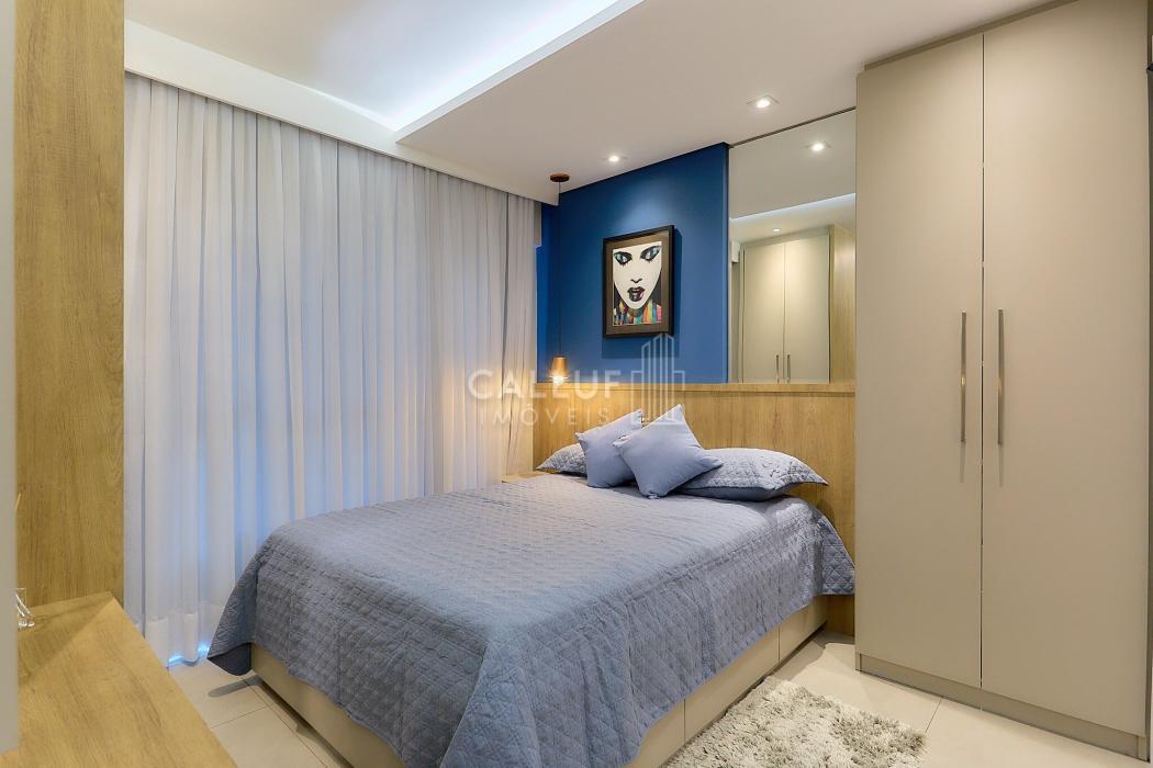 O dormitório conta com armários amplos, cama e criados-mudos.
