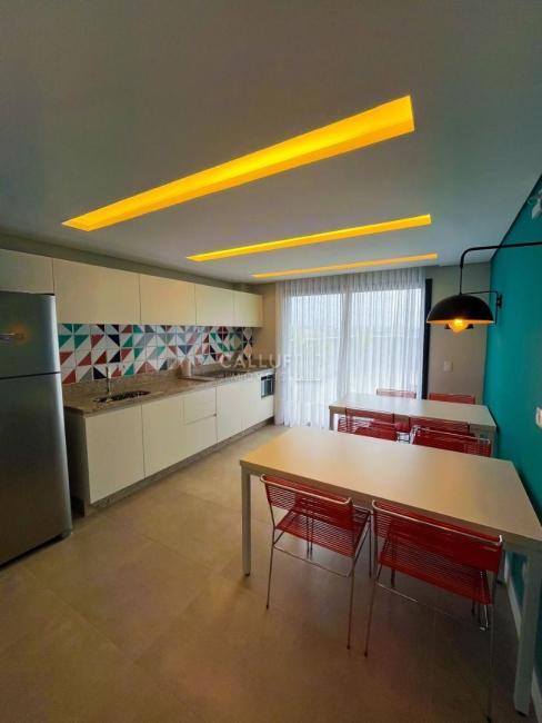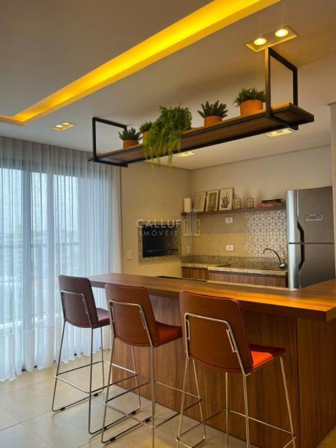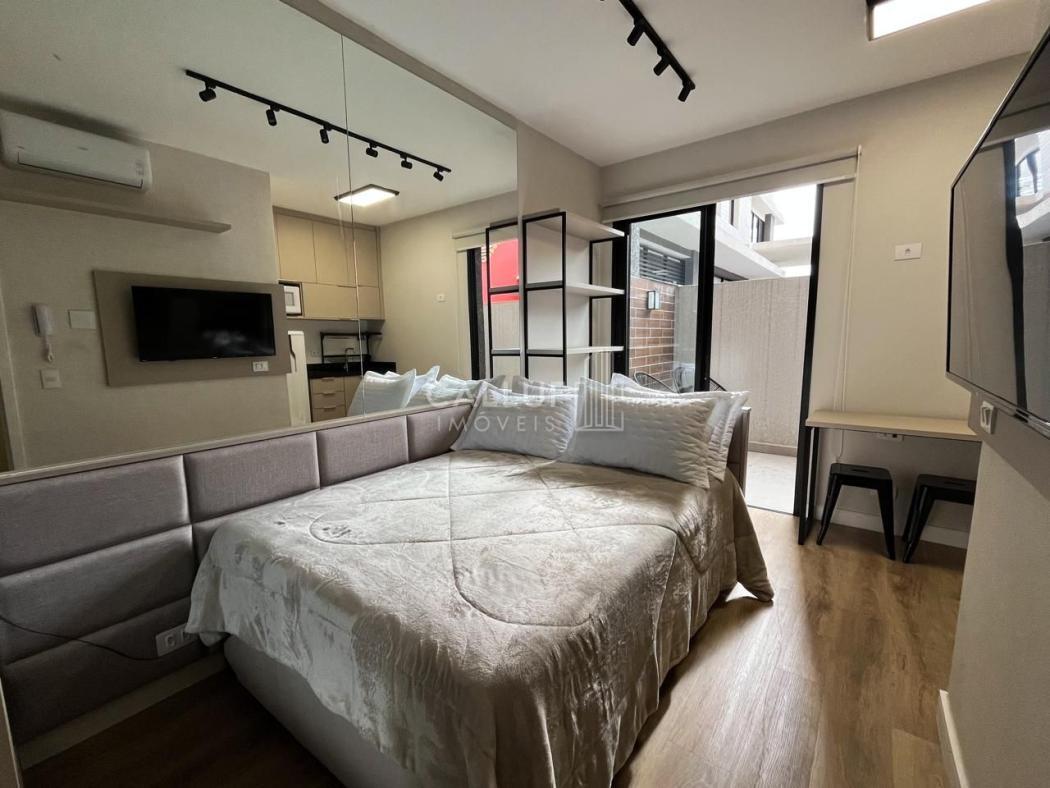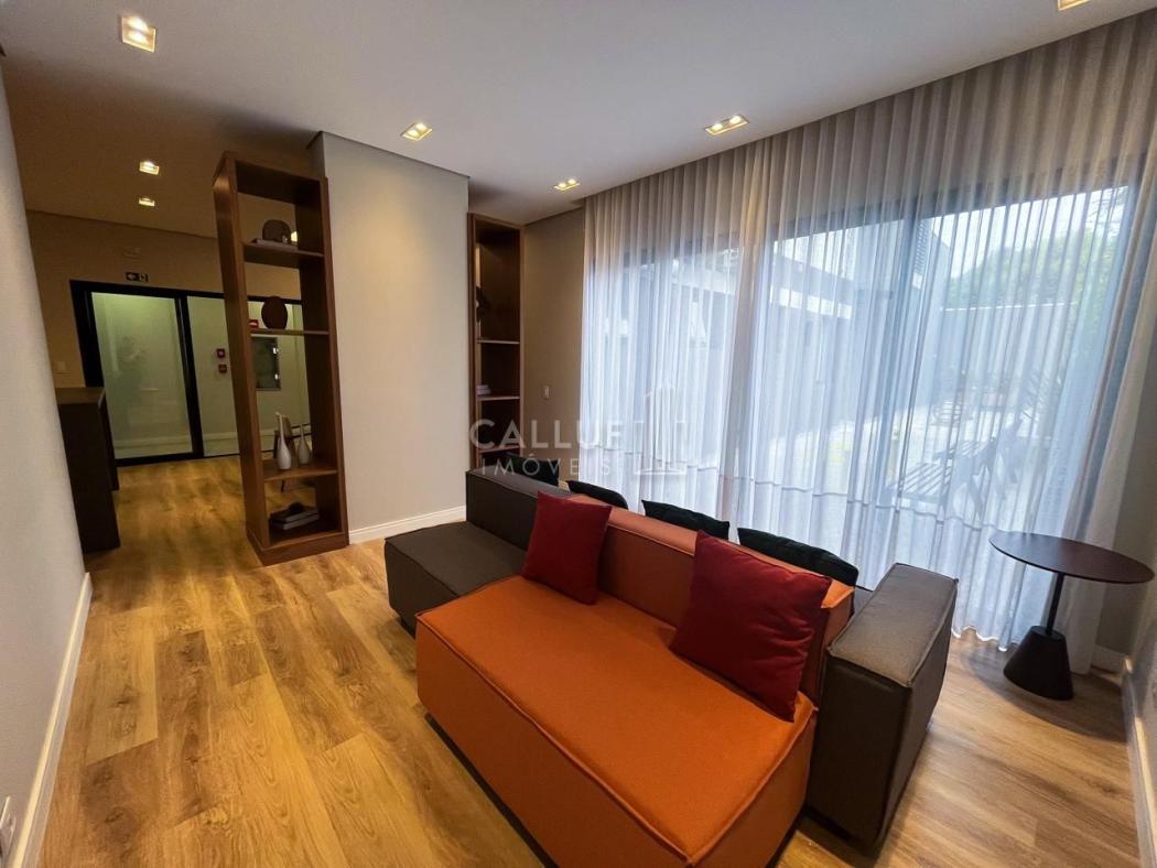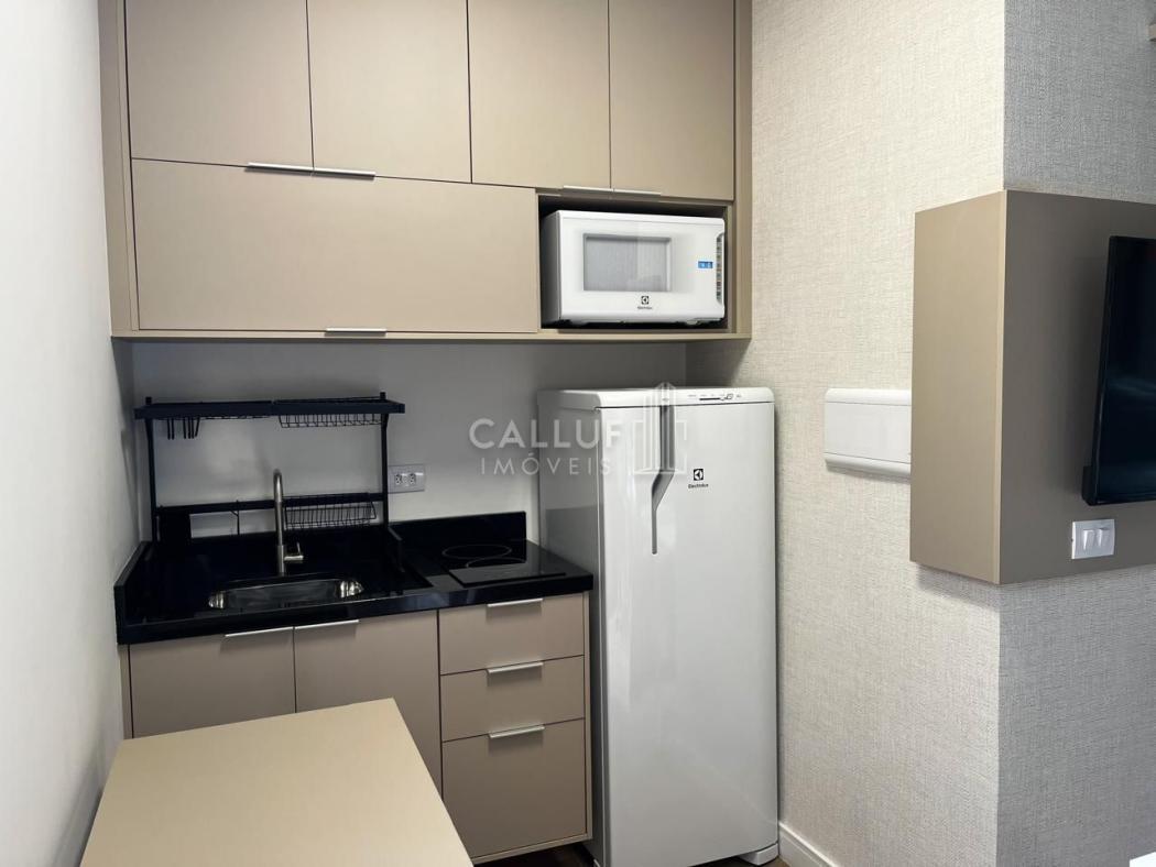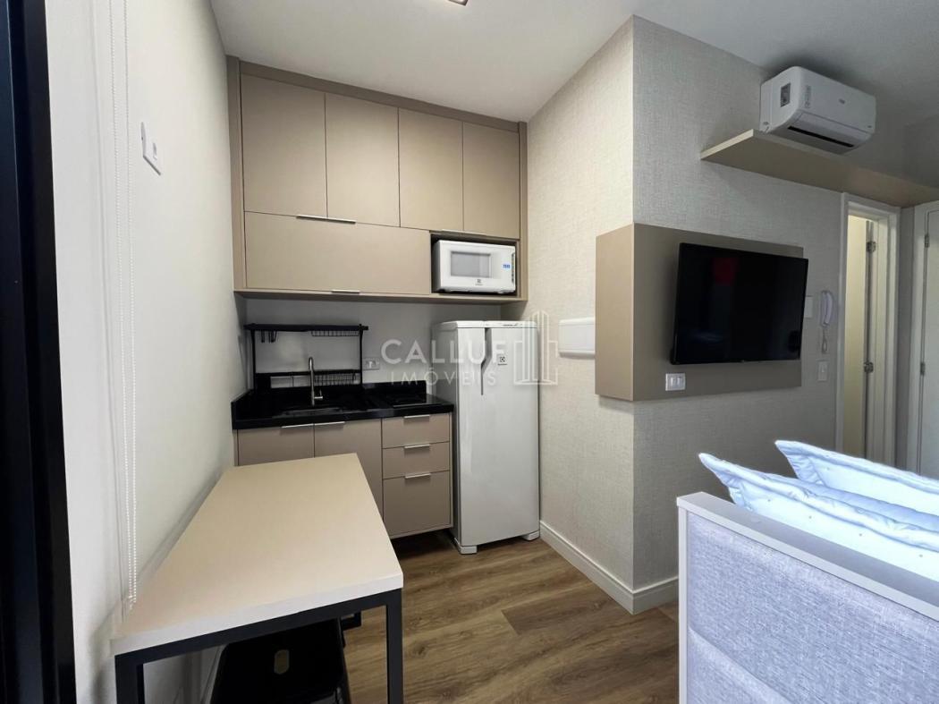 O imóvel de 25m² privativos mobiliado, conta com: cozinha planejada equipada com geladeira, cooktop de indução e micro-ondas; Mesa para refeições; quarto com cama baú de casal; TV e armários embutidos, além de ar condicionado e varanda.