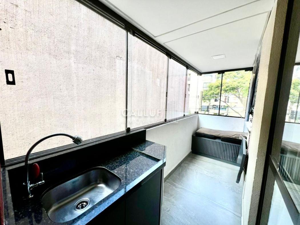 SACADA COM CHURRASQUEIRA, PIA COM ARMÁRIO SOB MEDIDA, BANCO COM NICHO, SACADA FECHADA EM VIDRO,