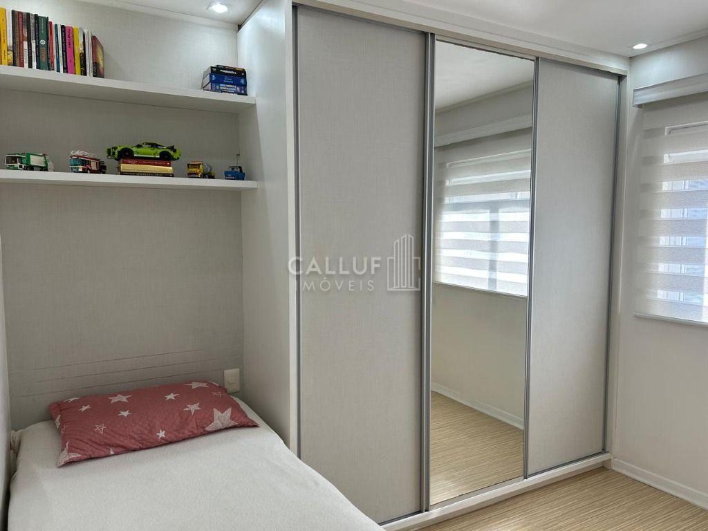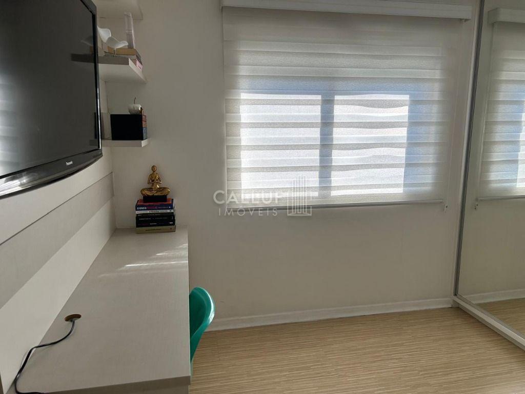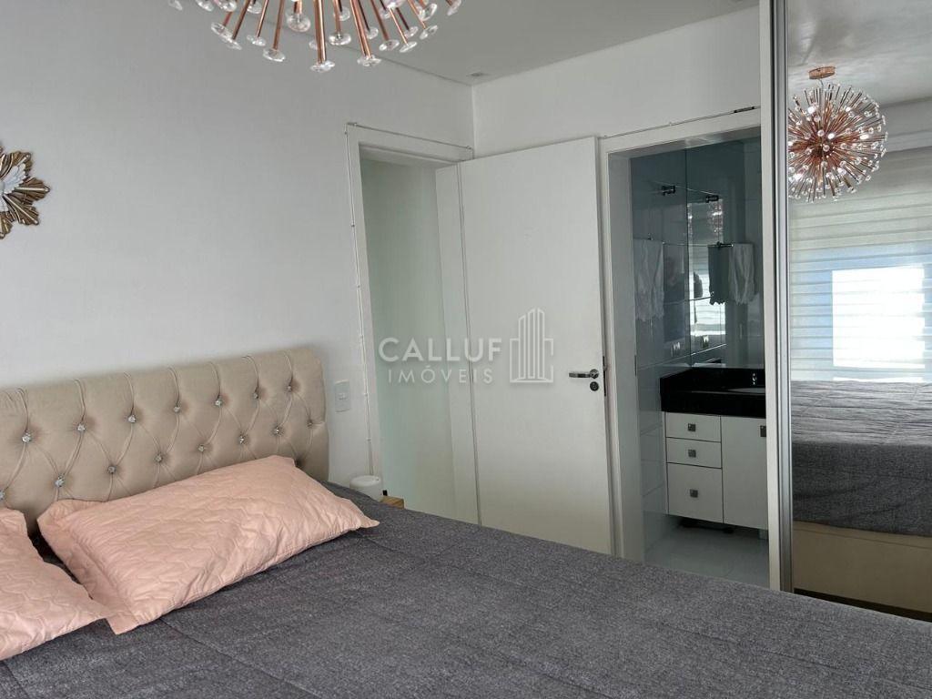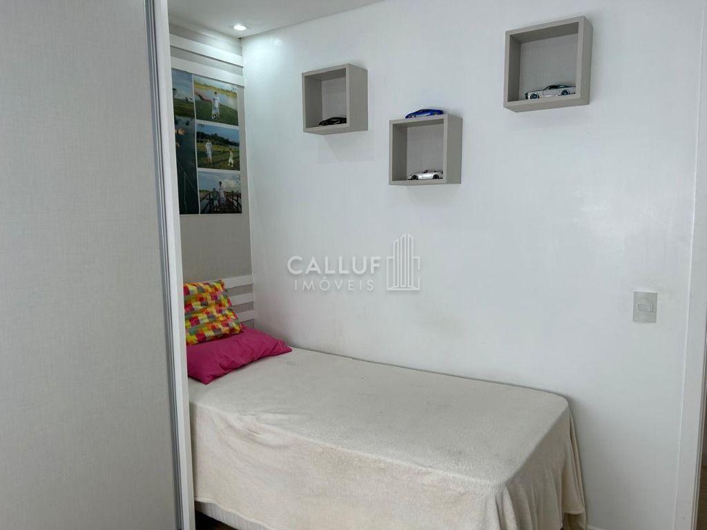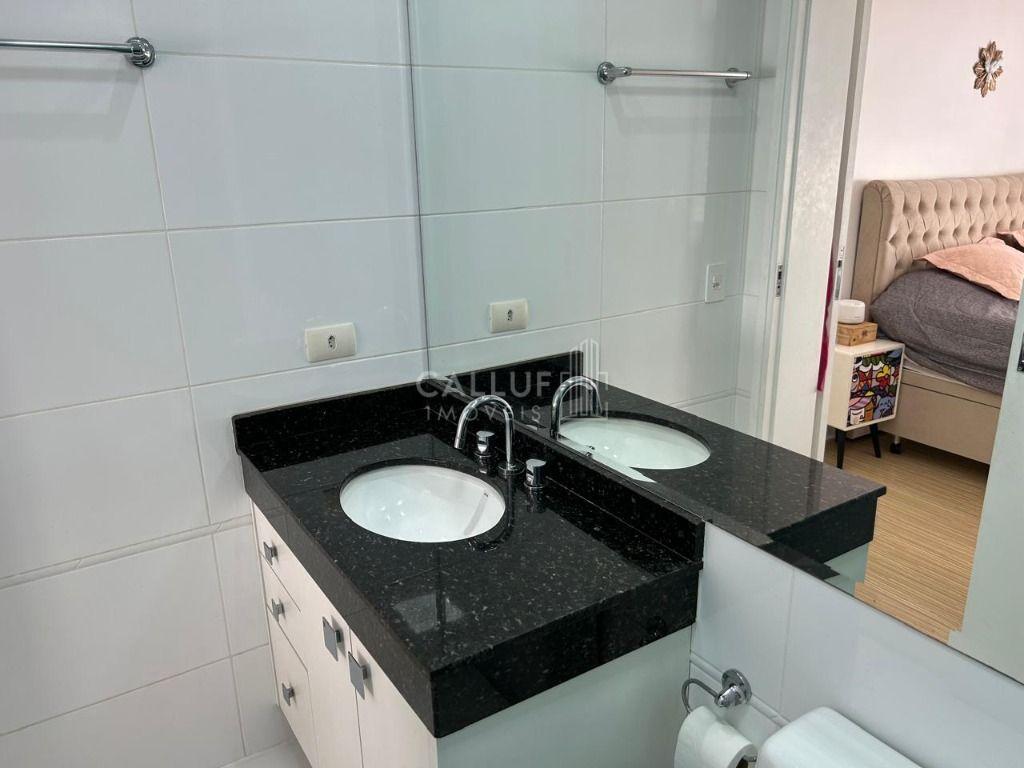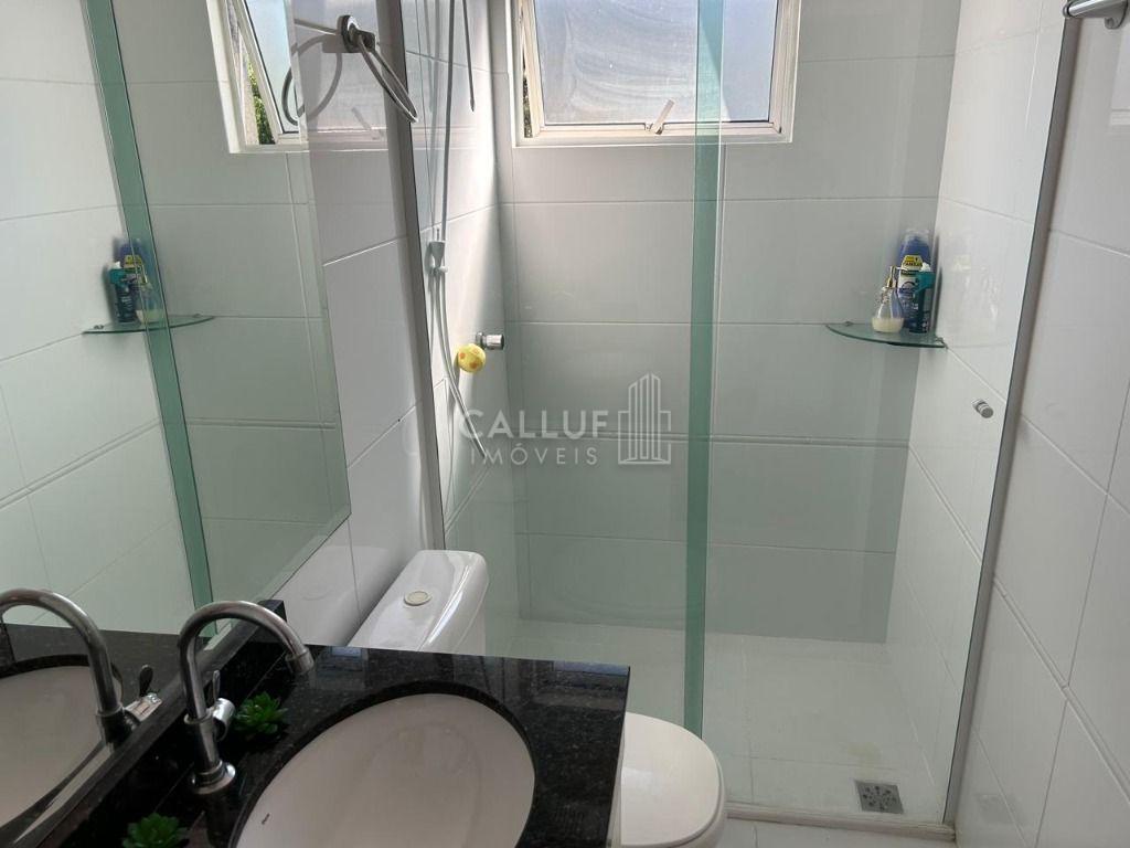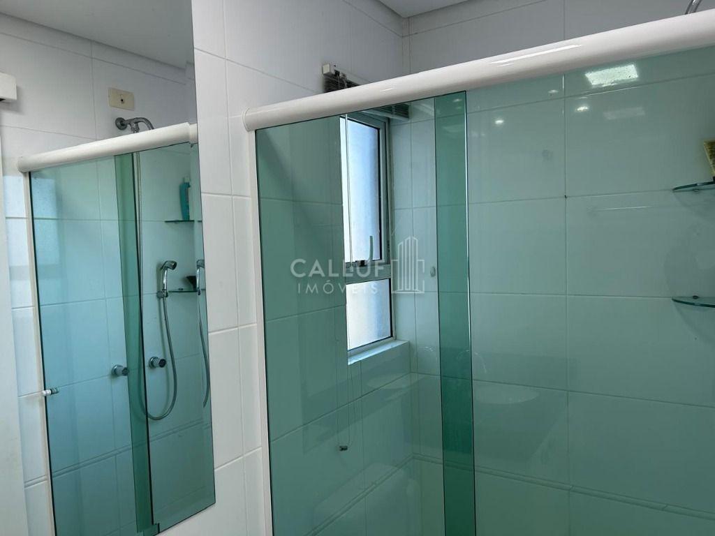 Banheiro da Suíte com armário com tampo em granito e box Blindex.