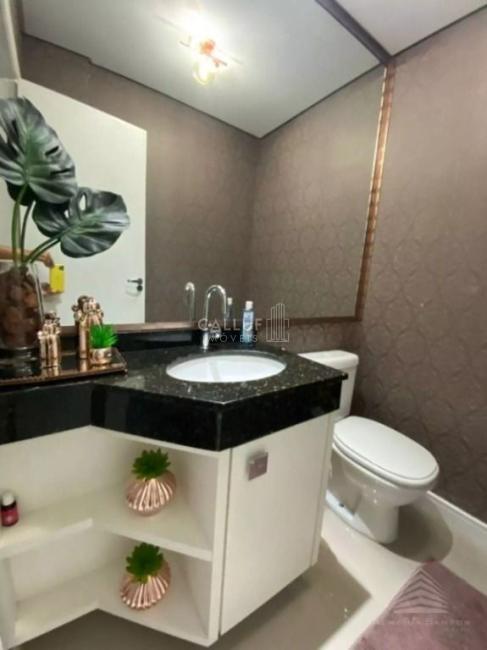 Banheiros Social com armário com tampo em granito e box Blindex.