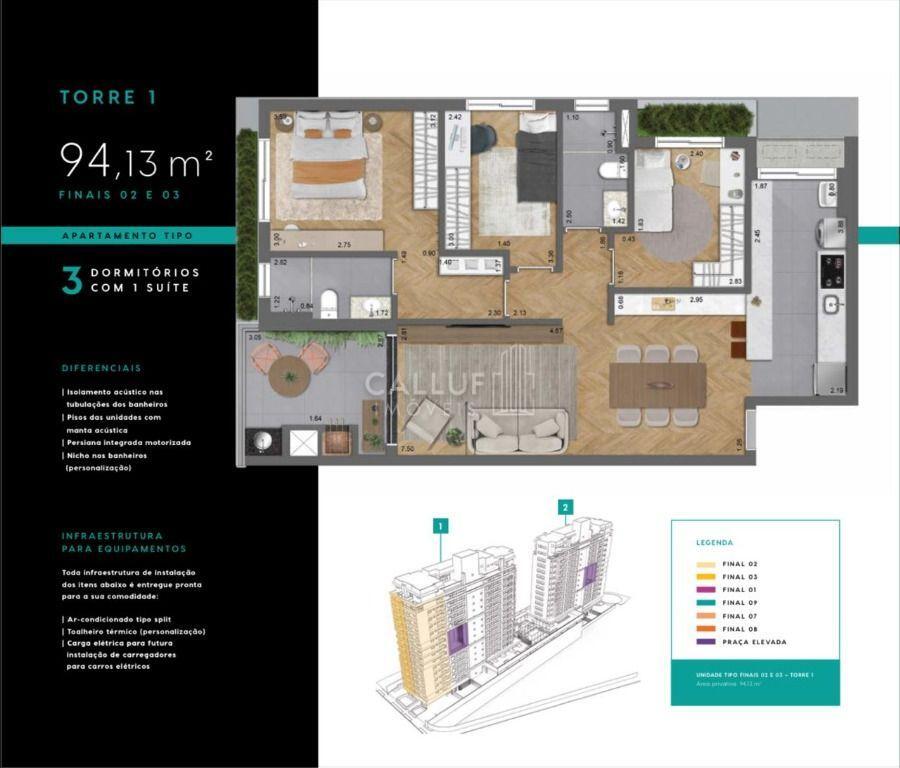 São 94m² privativos, revelando a qualidade e o bom gosto que seu imóvel merece. Ampla sala para ambientes planejados, cozinha em open concept , três quartos, sendo uma suíte. Ambientes bastante ensolarados. Duas vagas próprias .