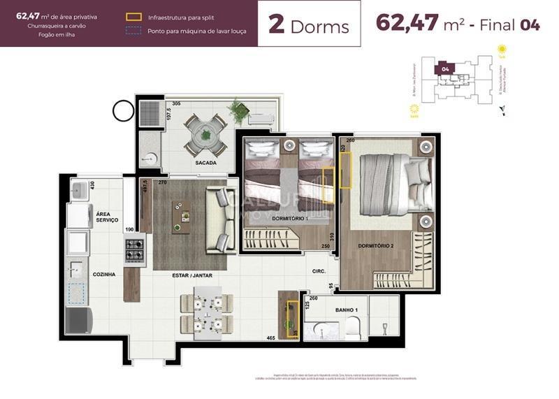 São 2 quartos com armários planejados, sala para dois ambientes; estar e jantar, com porta-janelão que integra a varanda, além de cozinha equipada com armários, cooktop, forno e área de serviço funcional. O imóvel conta ainda com 1 banheiro e 1 vaga de garagem.