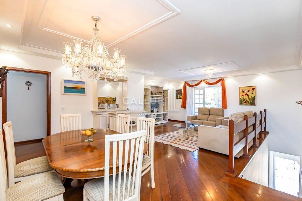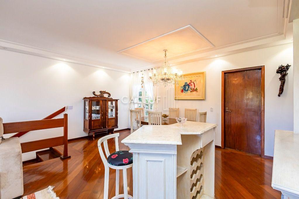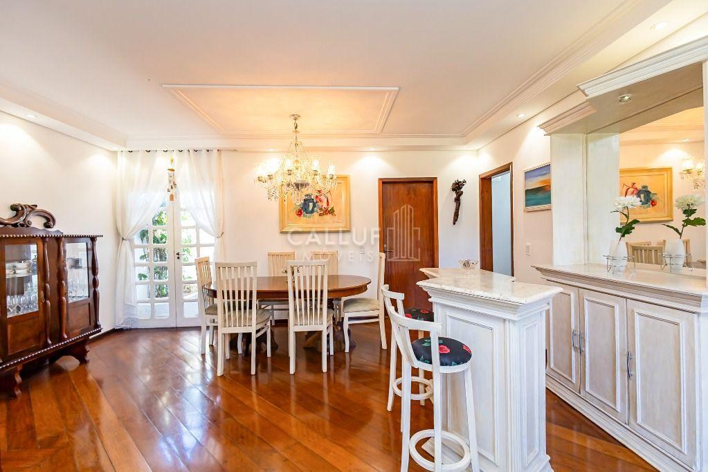 Sala de jantar completa com mesa, cadeiras, barzinho com banquetas, sofá e estante;