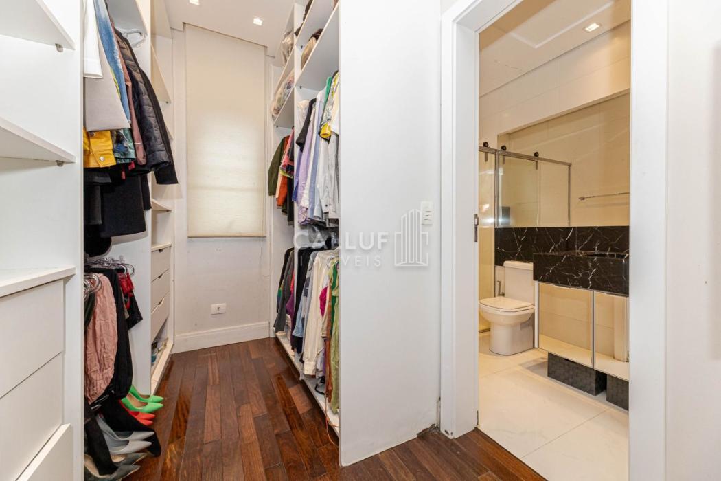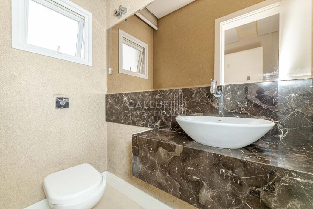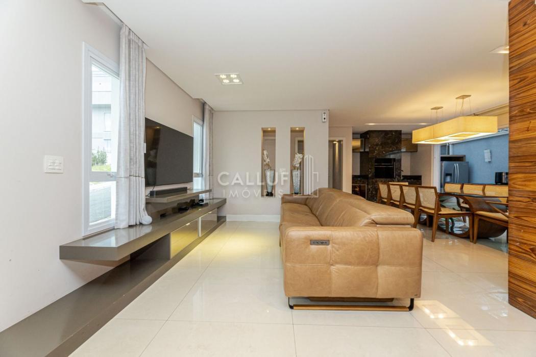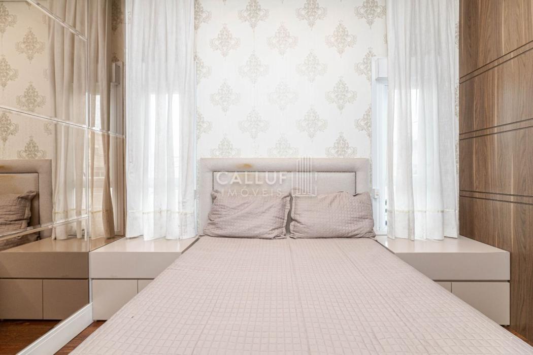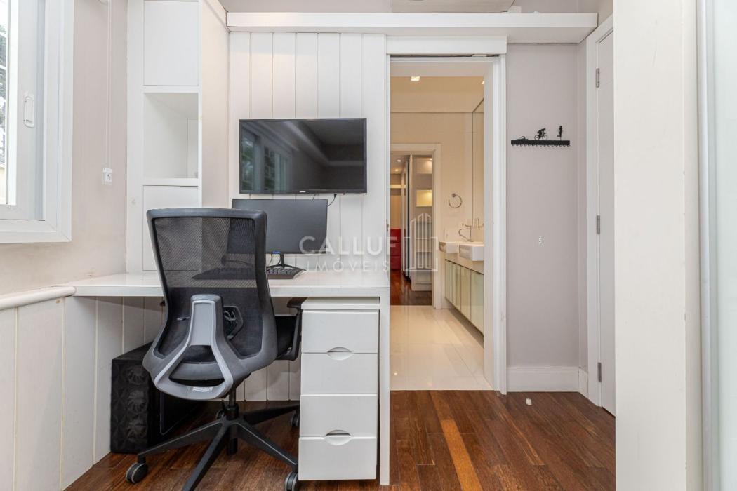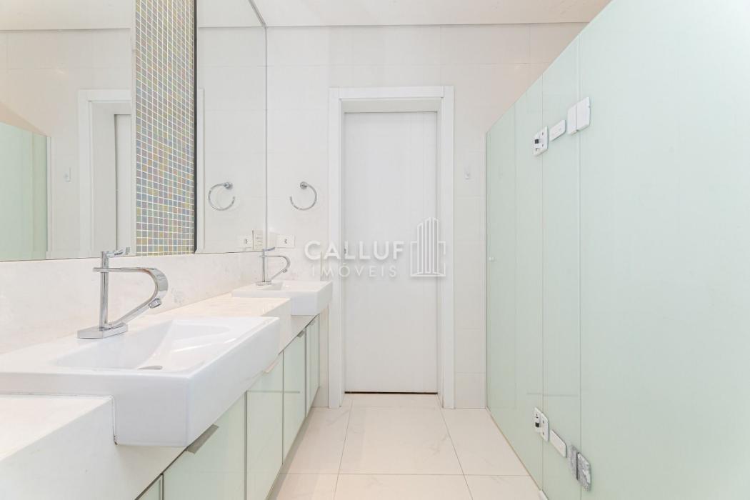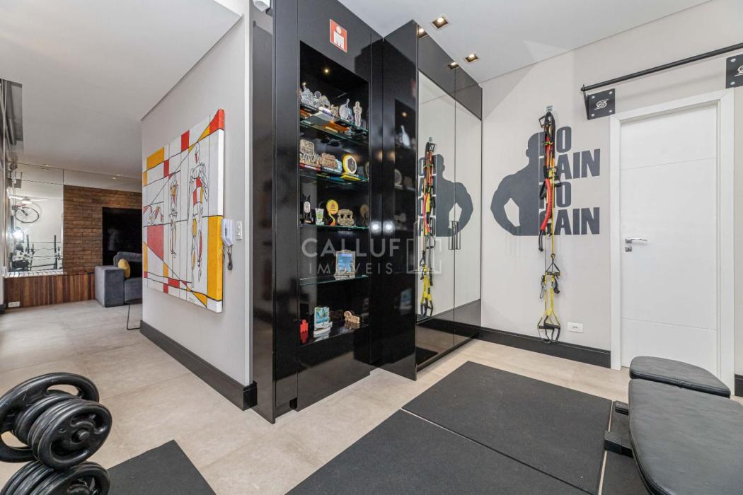 Térreo: Um espaço integrado com pé-direito duplo que proporciona amplitude e luminosidade à sala de jantar e à sala de TV. Jardim de inverno (atualmente espaço pet), lavabo, cozinha planejada com armários e tampo em granito, despensa e churrasqueira coberta com teto de vidro retrátil, perfeita para receber amigos em qualquer estação.
