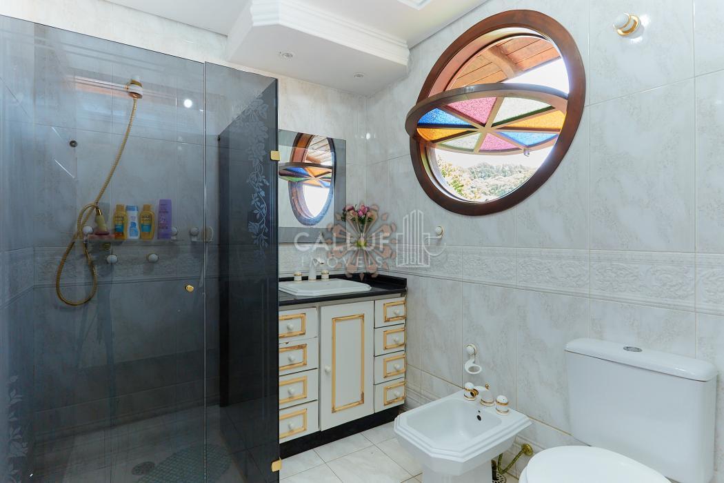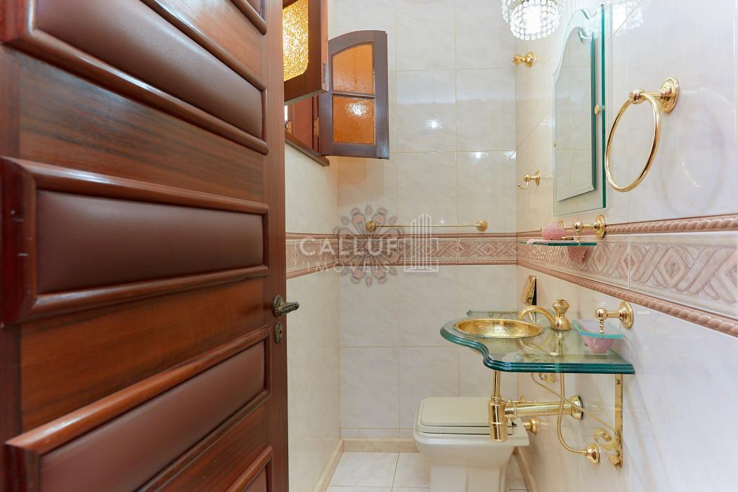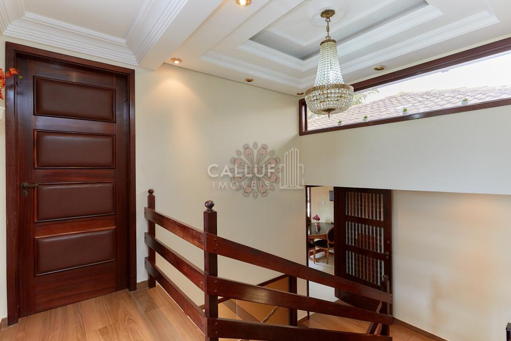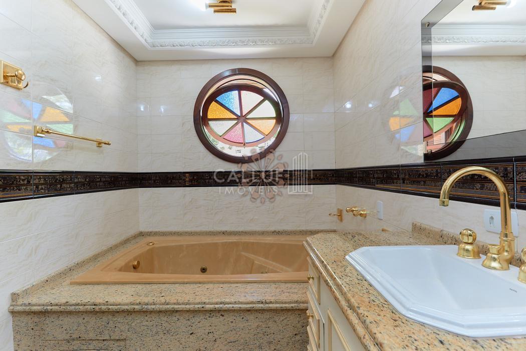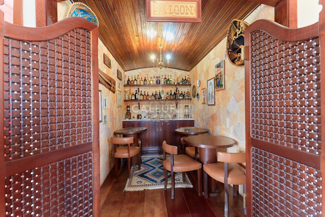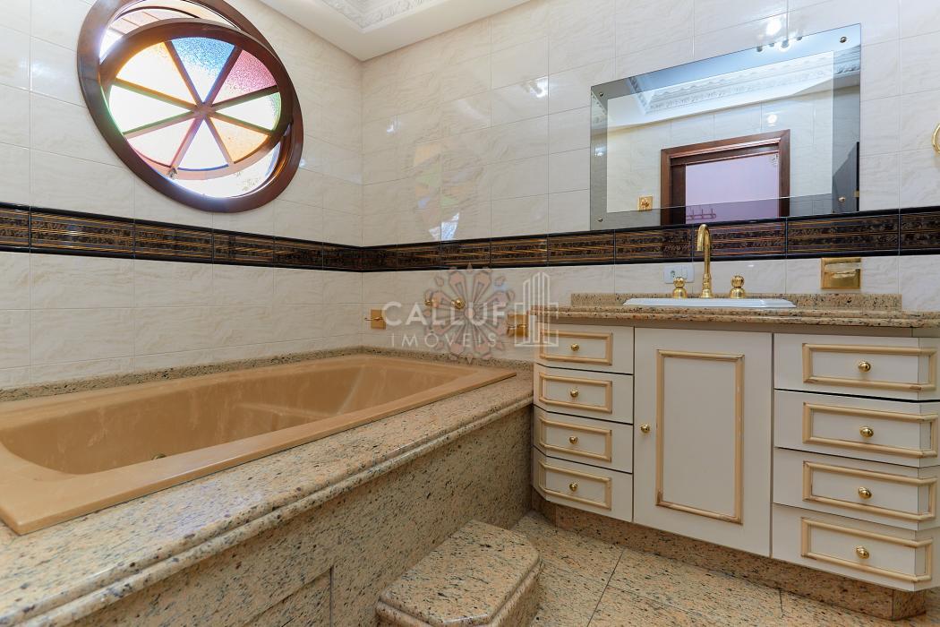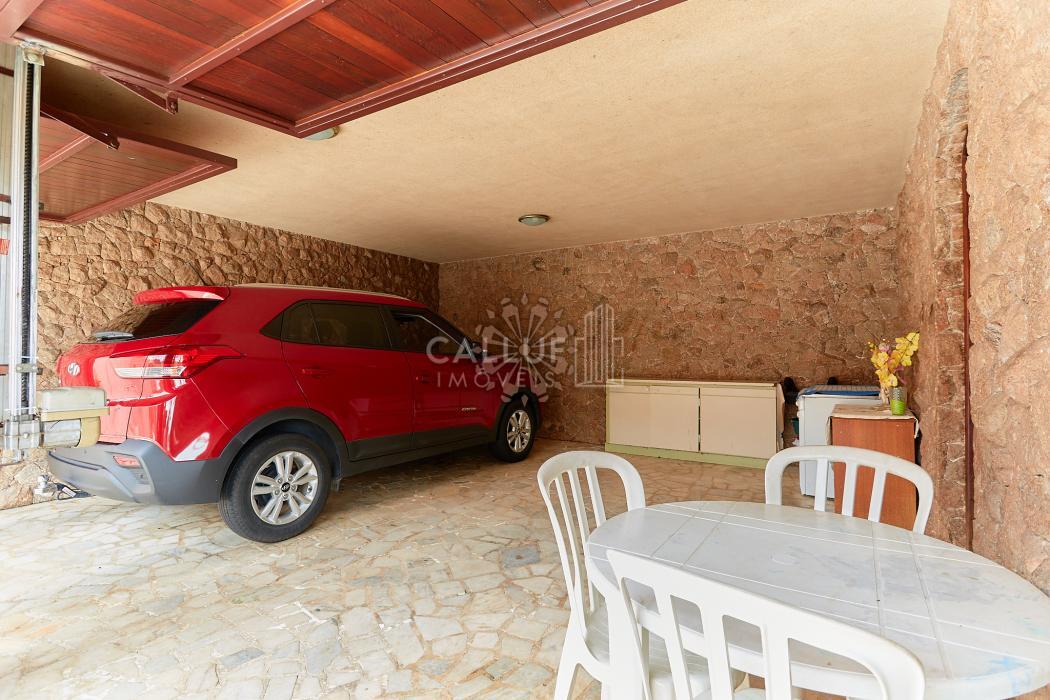 A residência possui 268,71 m² averbados e conta com sala de estar e jantar em desnível, bar ou adega, sala de TV, escritório, varanda e banheiro social. Na área íntima, dispõe de quatro dormitórios com armários planejados, sendo uma suíte com banheira de hidromassagem. A cozinha é planejada e integrada à copa, contando também com despensa e lavanderia. Na parte externa, há churrasqueira e canil.