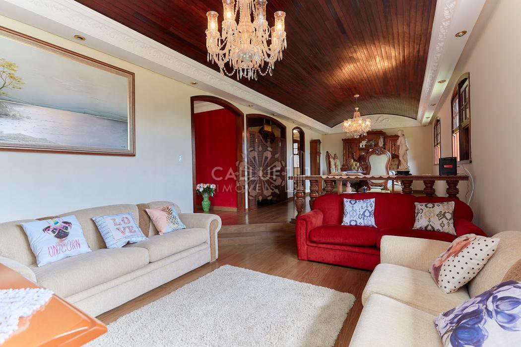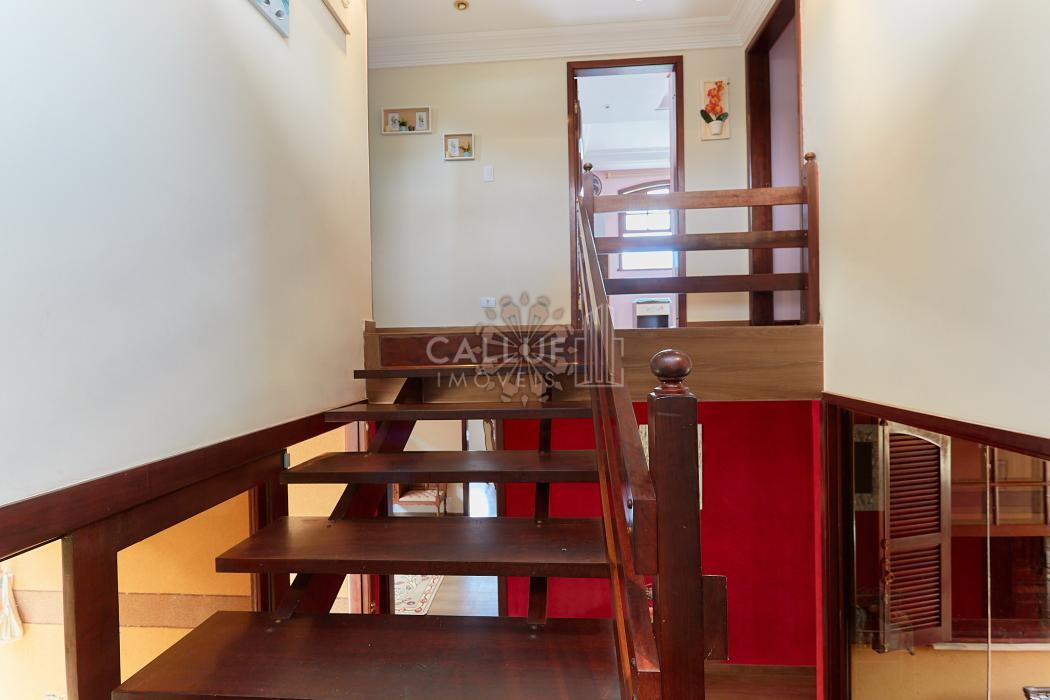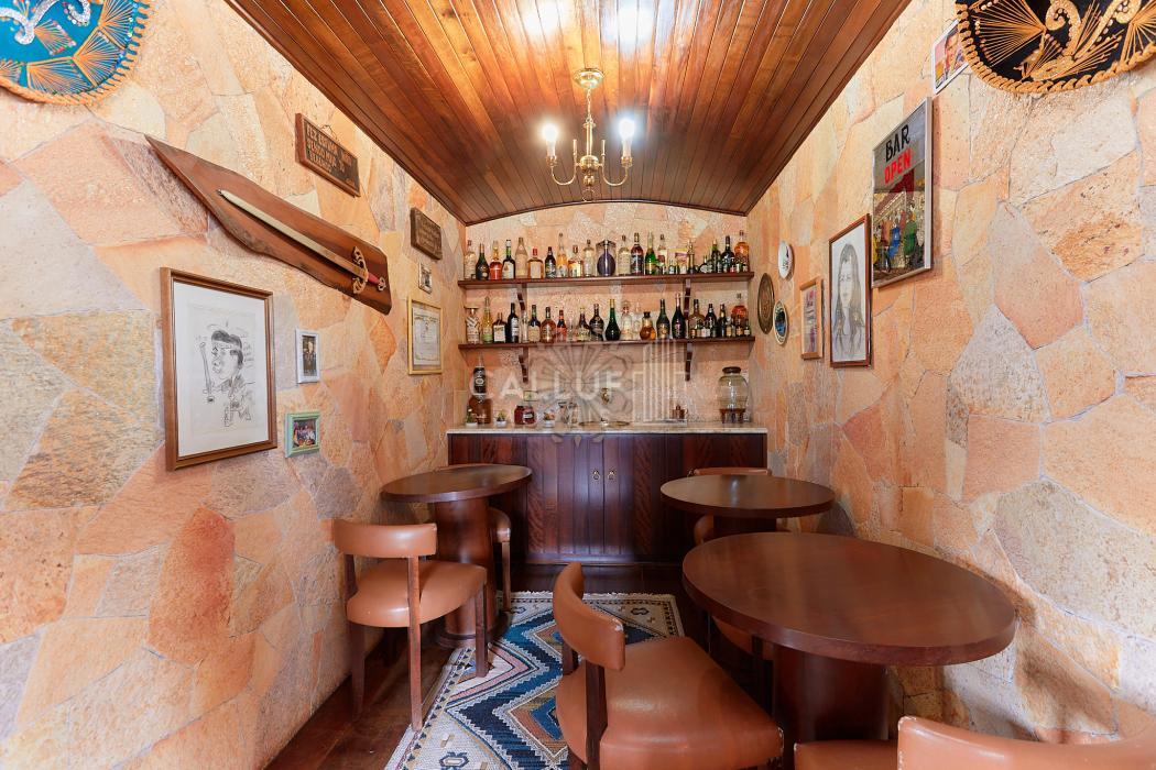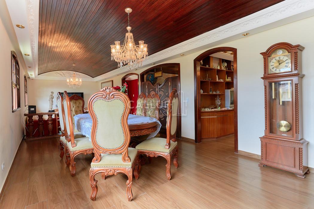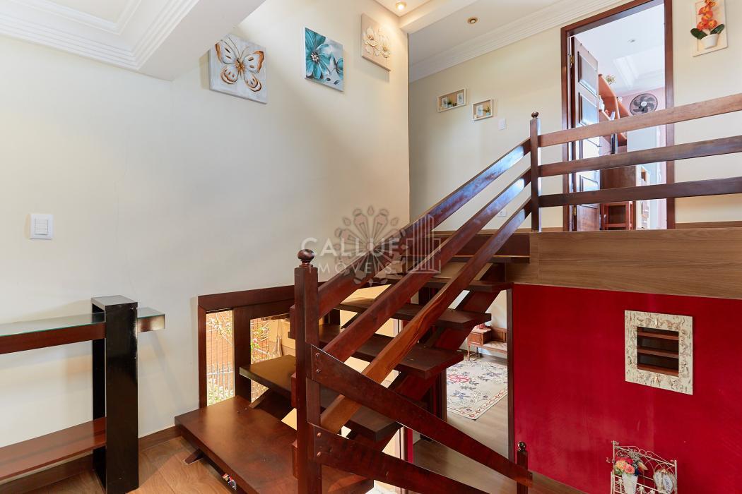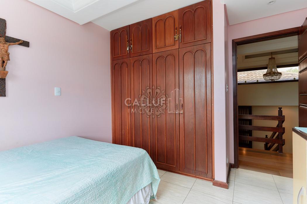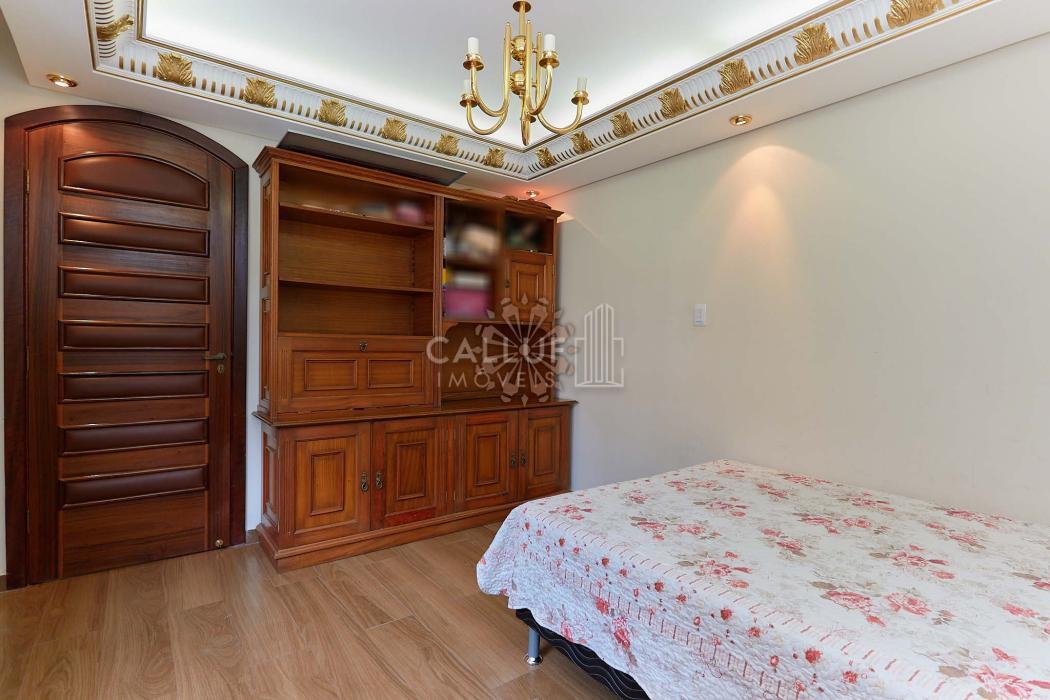 A residência possui 268,71 m² averbados e conta com sala de estar e jantar em desnível, bar ou adega, sala de TV, escritório, varanda e banheiro social. Na área íntima, dispõe de quatro dormitórios com armários planejados, sendo uma suíte com banheira de hidromassagem. A cozinha é planejada e integrada à copa, contando também com despensa e lavanderia. Na parte externa, há churrasqueira e canil.