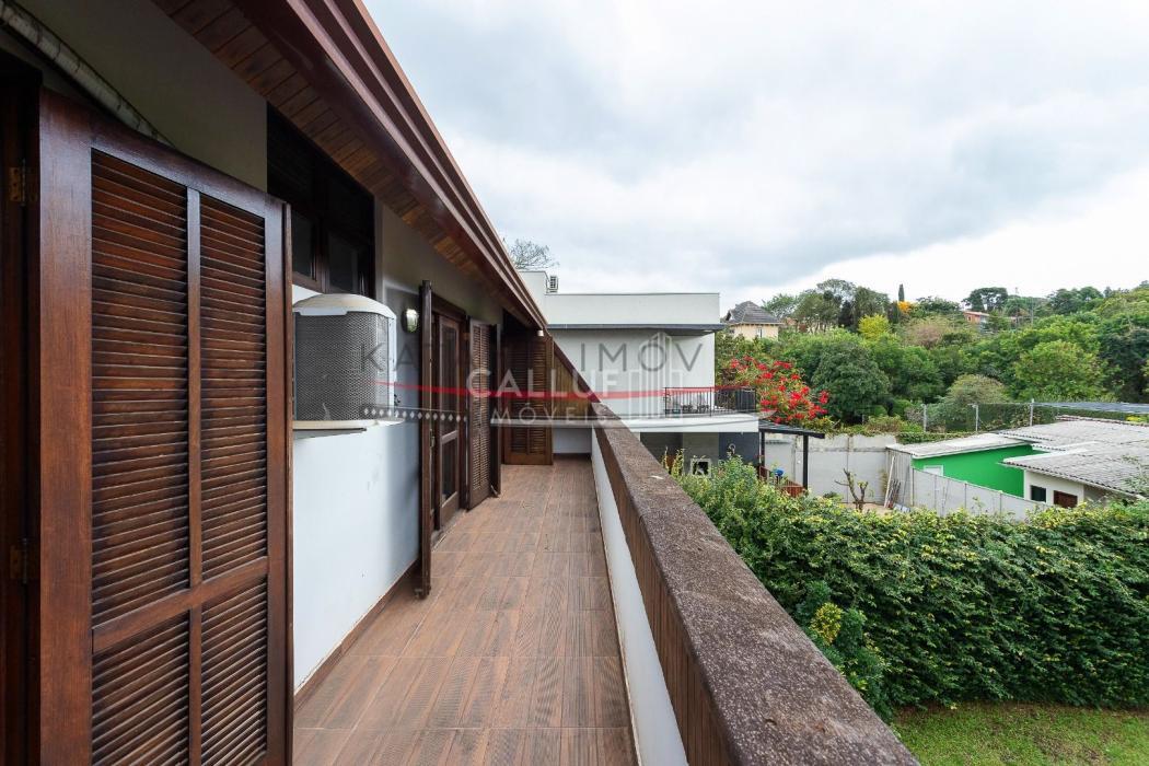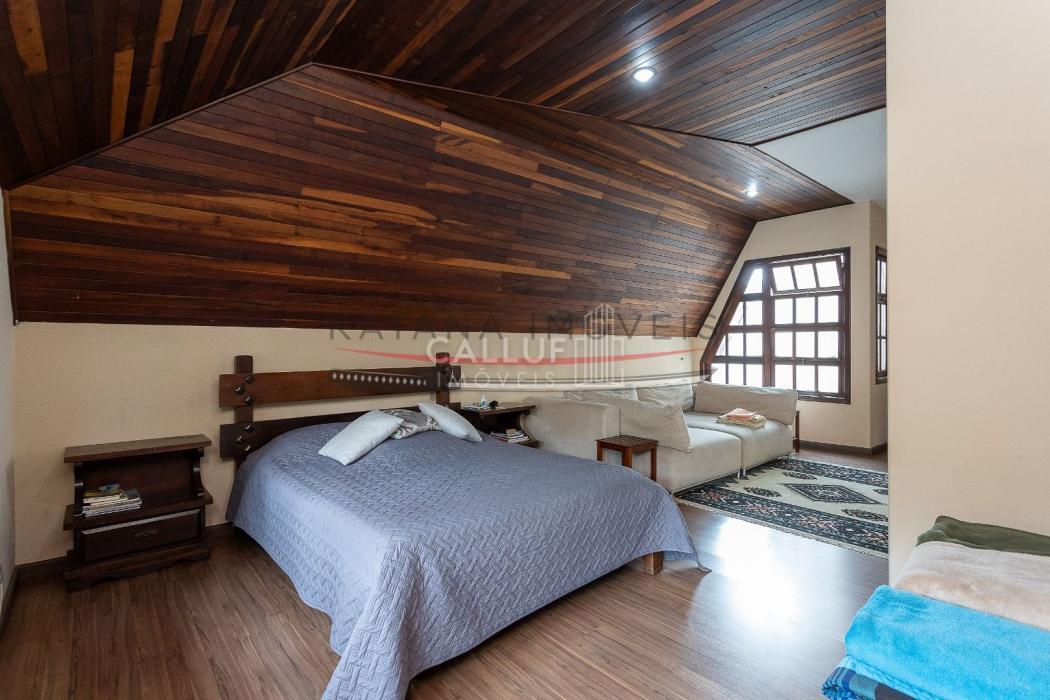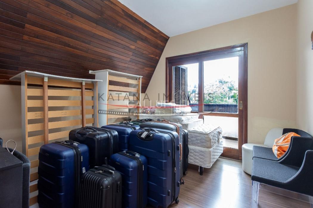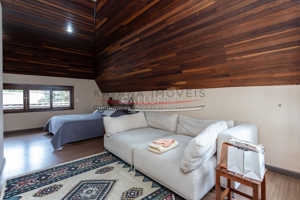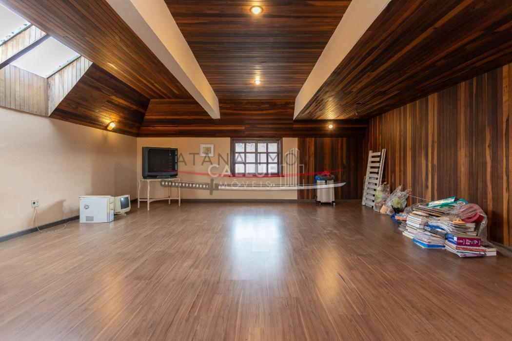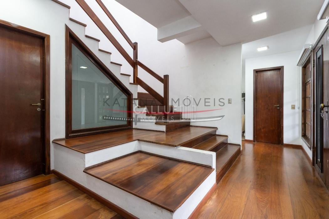 São 4 andares, tendo no primeiro piso ampla garagem, churrasqueira, salão de festas e um terreno com área verde extremamente ampla, com uma casa aos fundos (casa para caseiro, atelier) com 80m² e um depósito de 20m². No segundo piso temos salas amplas, escritório, cozinha, lavanderia e área de serviço. Os 4 quartos, sendo 3 suítes e uma demi ficam no terceiro piso, com uma linda sacada e vista panorâmica. No 4° andar temos o ático, com 85m². A metragem do restante da casa soma 415m².