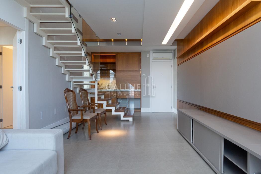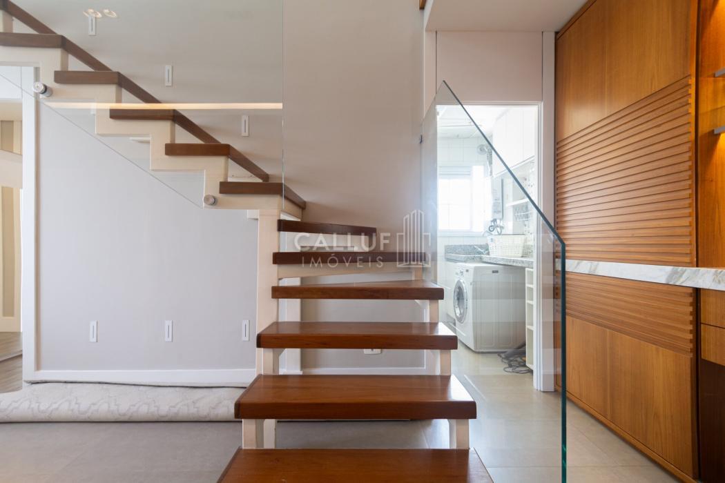 A escada, com seu guarda-corpo em vidro, é um elemento de destaque, conectando os ambientes com leveza e modernidade.