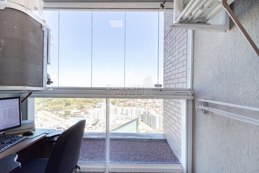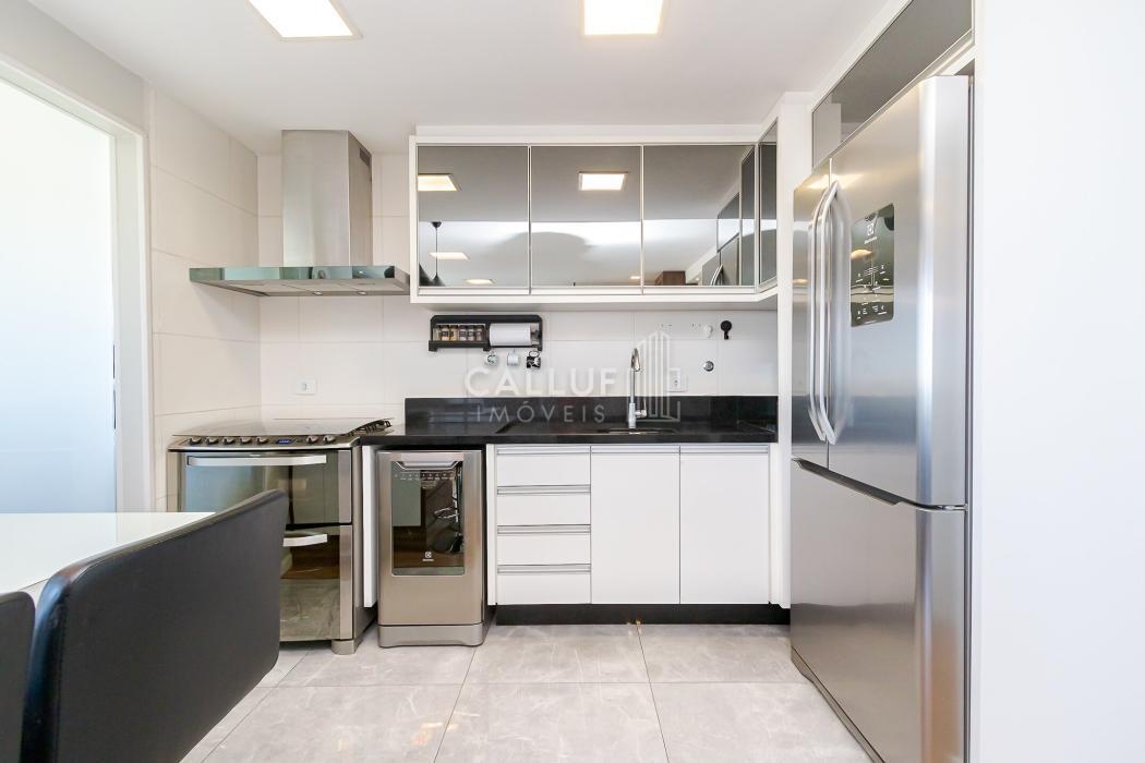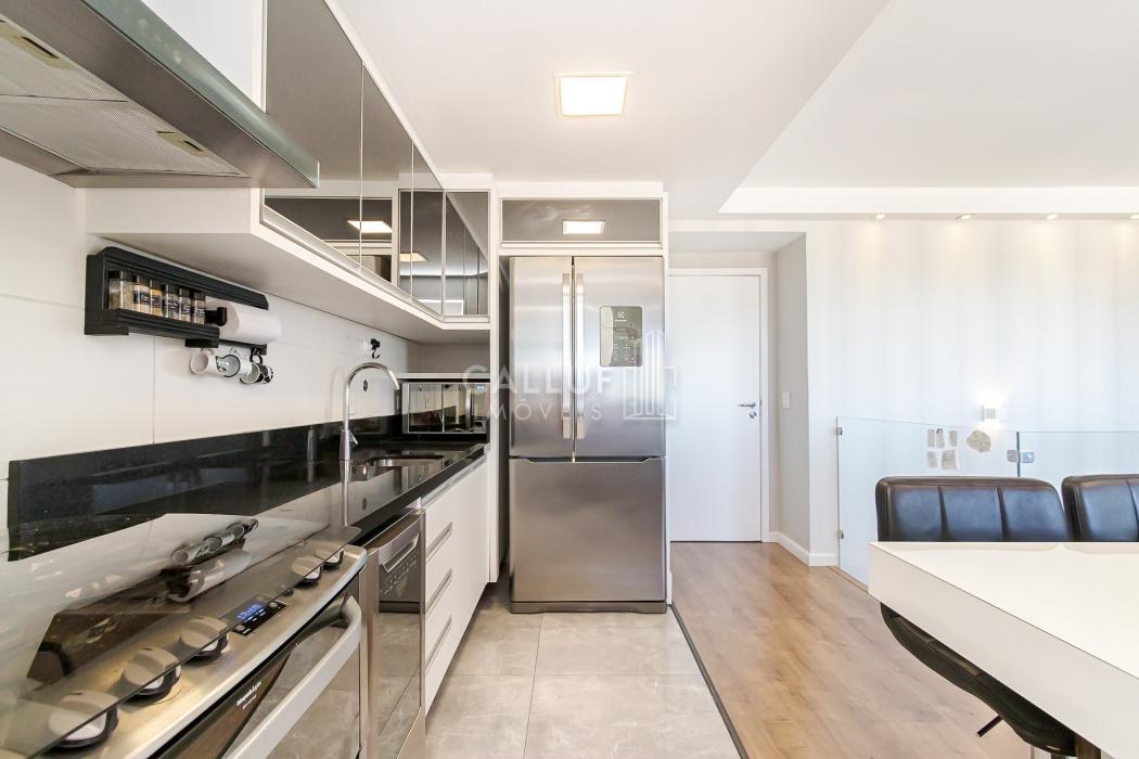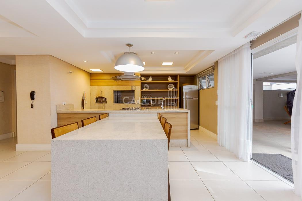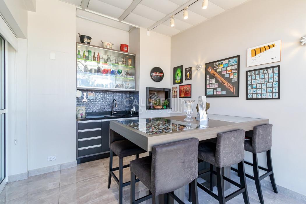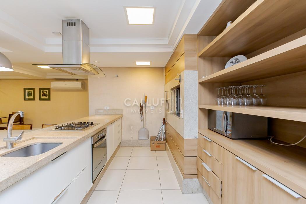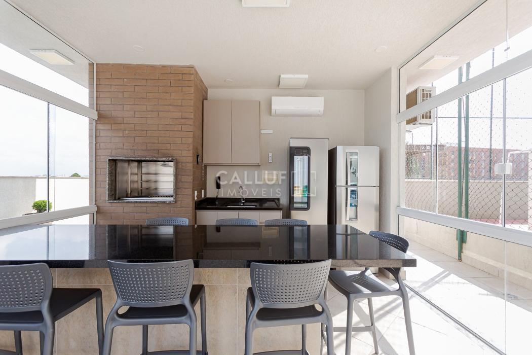 Cozinha prática e funcional, com lavandeira, sala de TV, lavabo e espaço gourmet com churrasqueira a carvão, todos com vista panorâmica para o cartão-postal da cidade, com uma iluminação natural abundante.