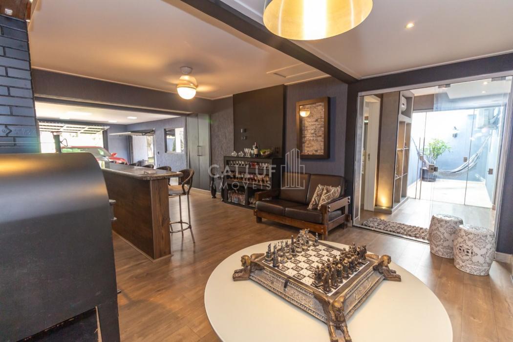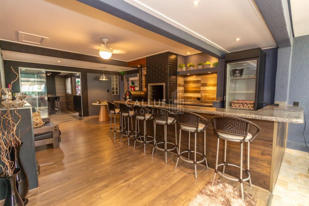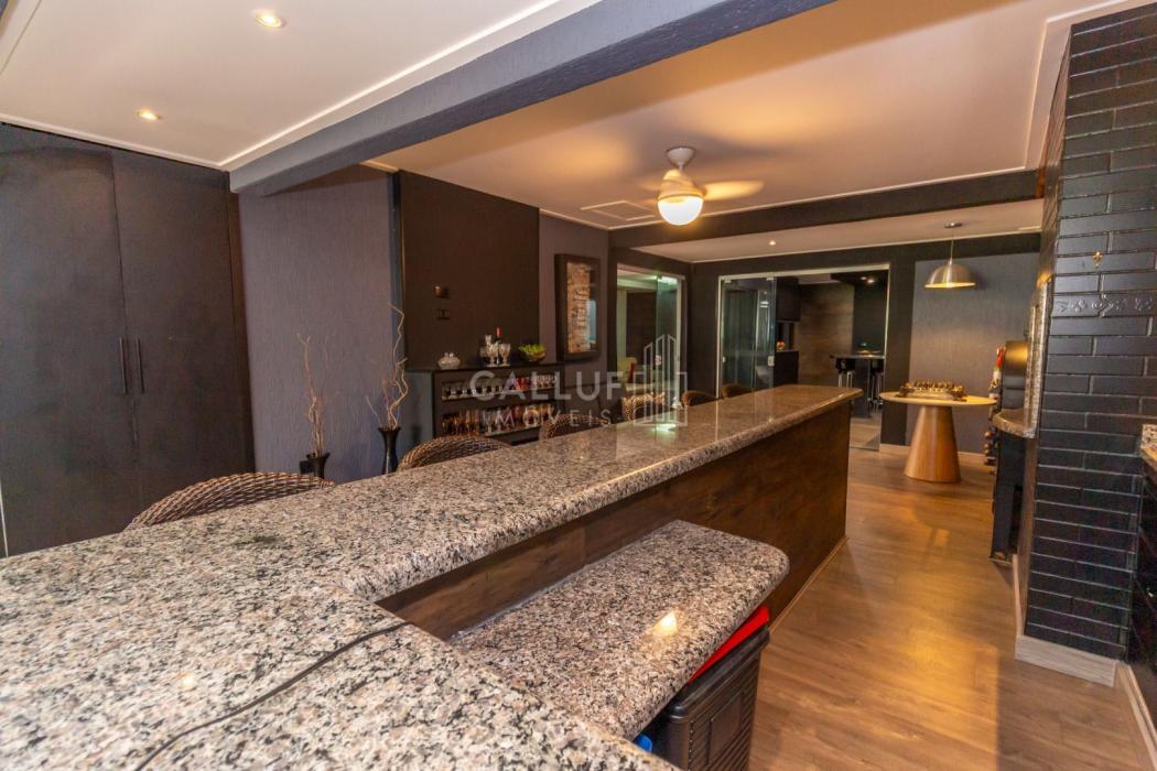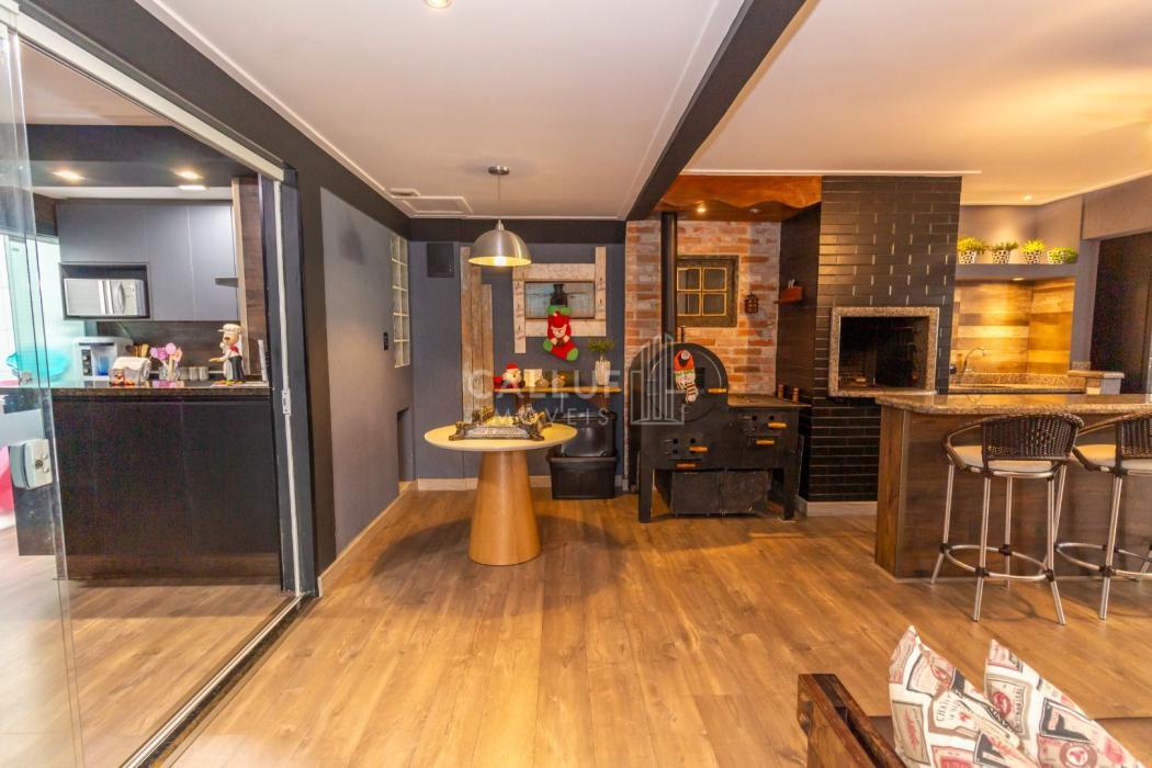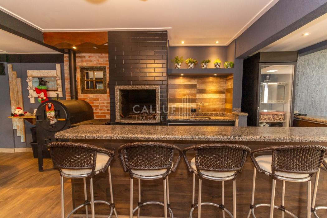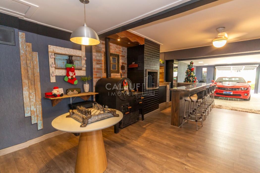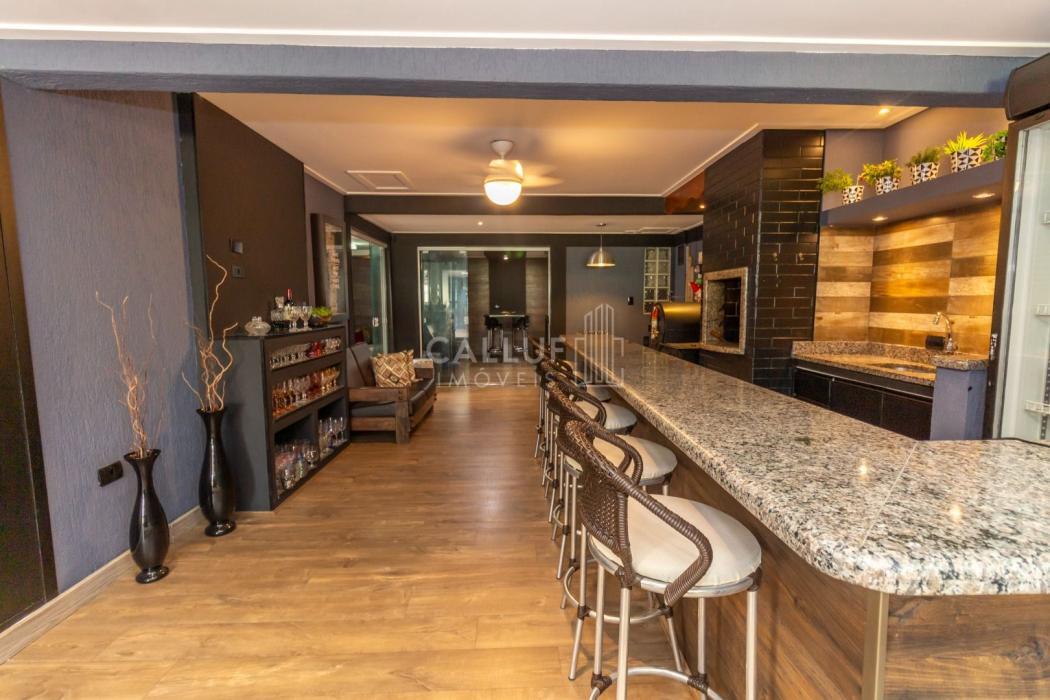 Área gourmet ampla, com 6 banquetas, forno de pizza, freezer e cristaleira;