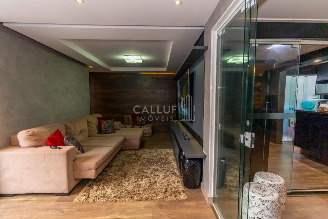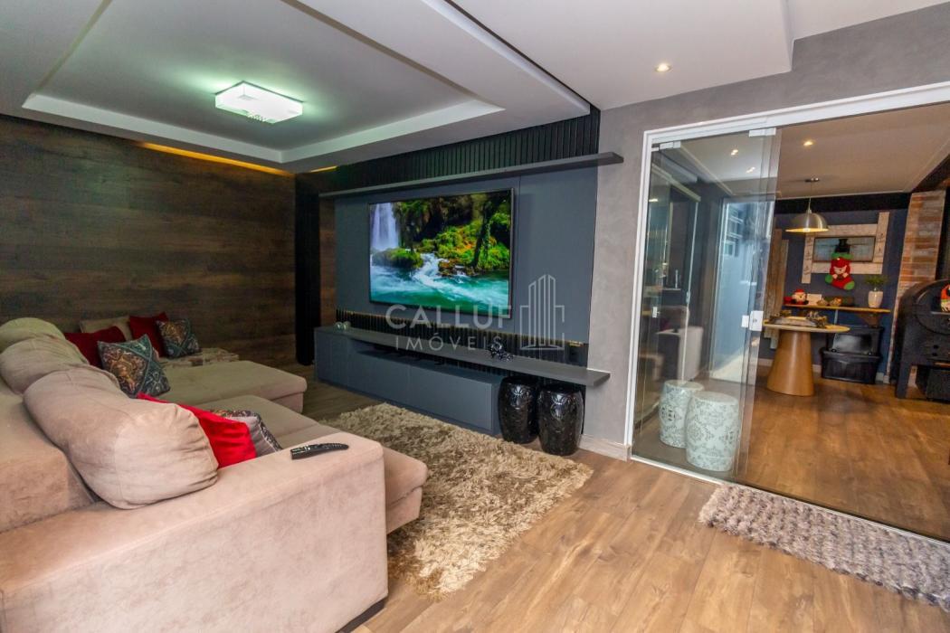 Sala de estar climatizada com painel de tv, estante e parede revestida em madeira;