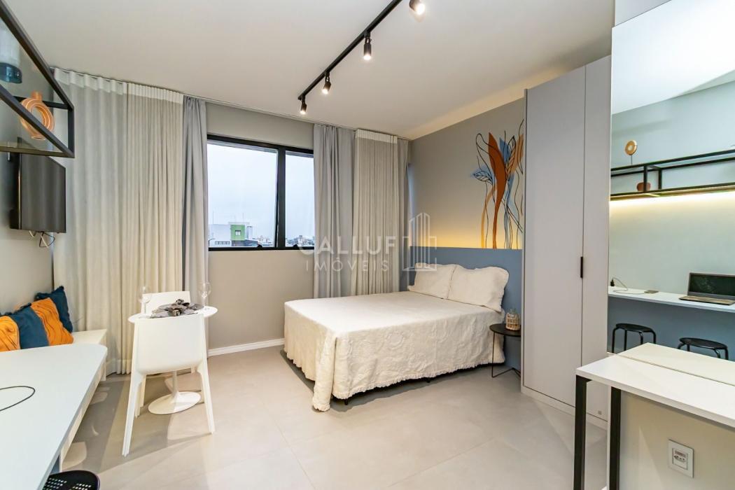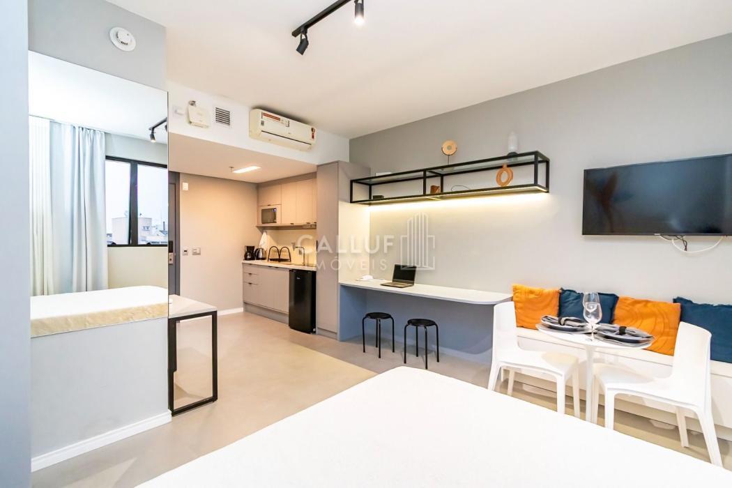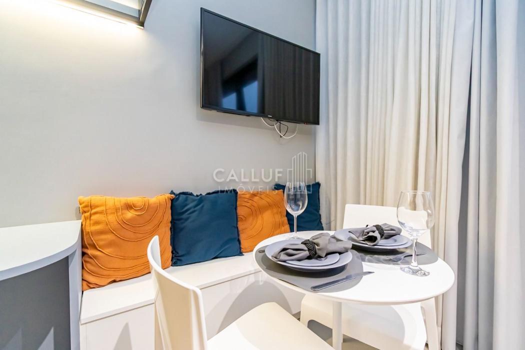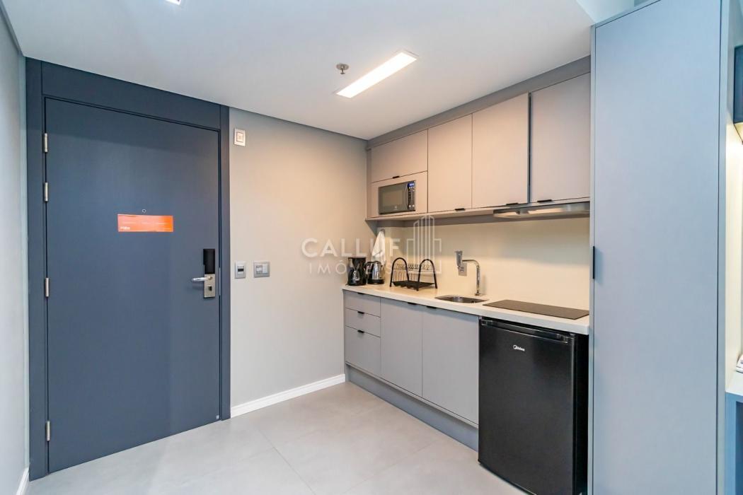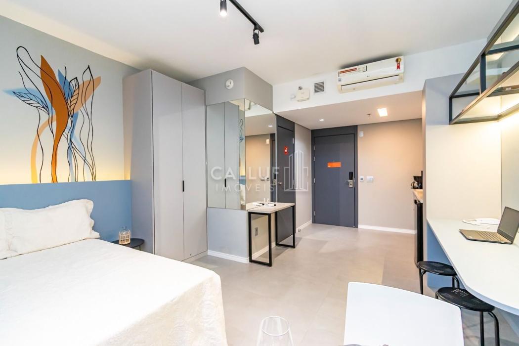 Mobiliado e Equipado: Sem custo extra! O studio já conta com Cama de Casal, Armário planejado, Cozinha privativa completa e Ar-condicionado.