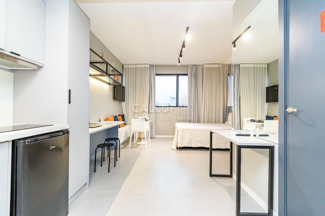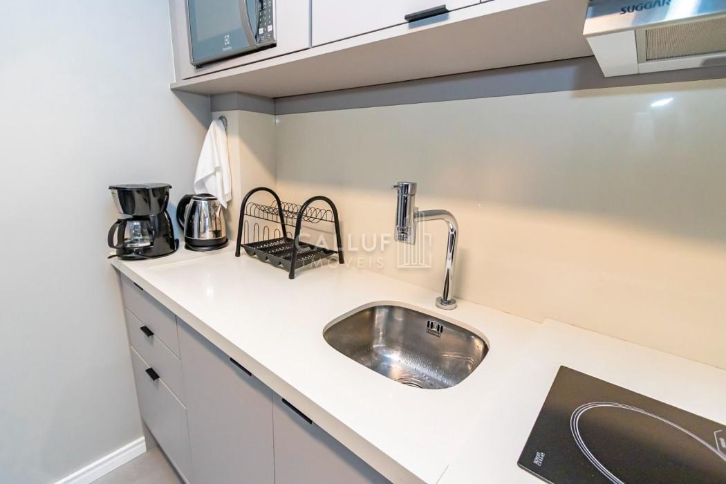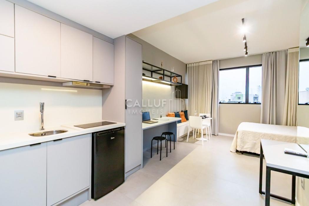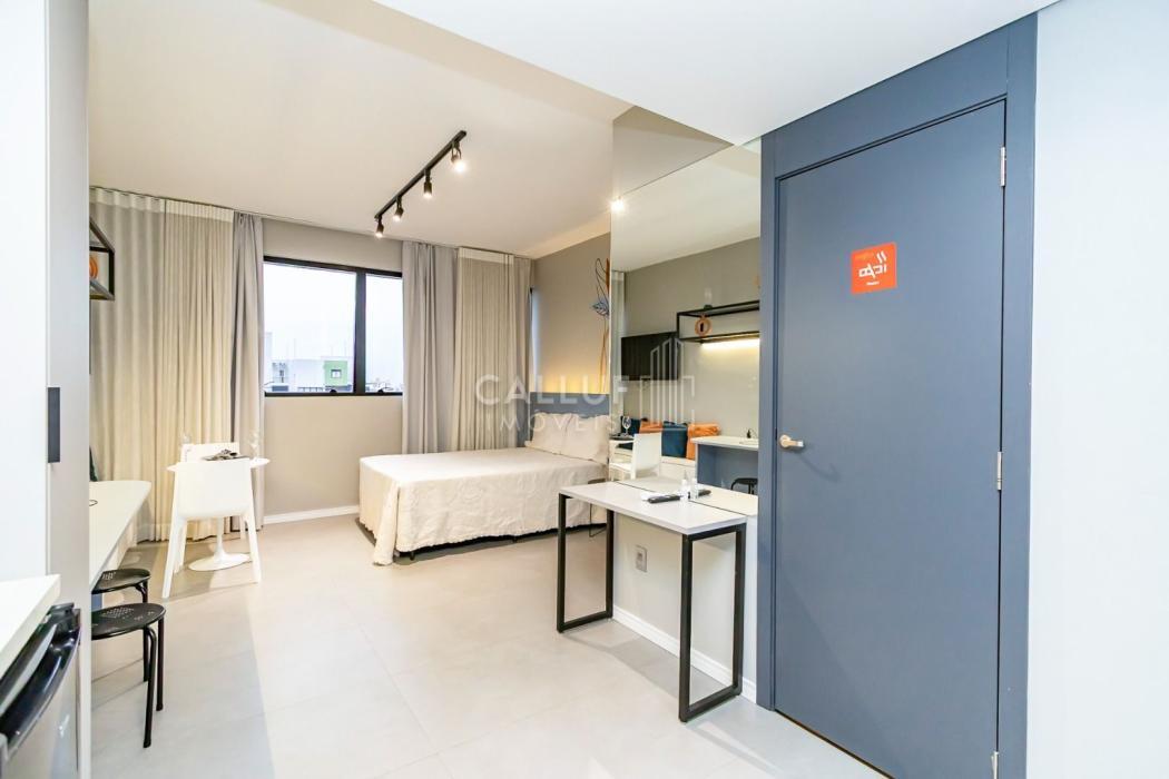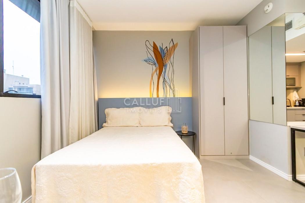 Mobiliado e Equipado: Sem custo extra! O studio já conta com Cama de Casal, Armário planejado, Cozinha privativa completa e Ar-condicionado.