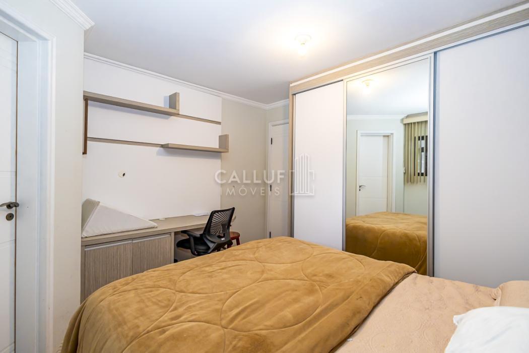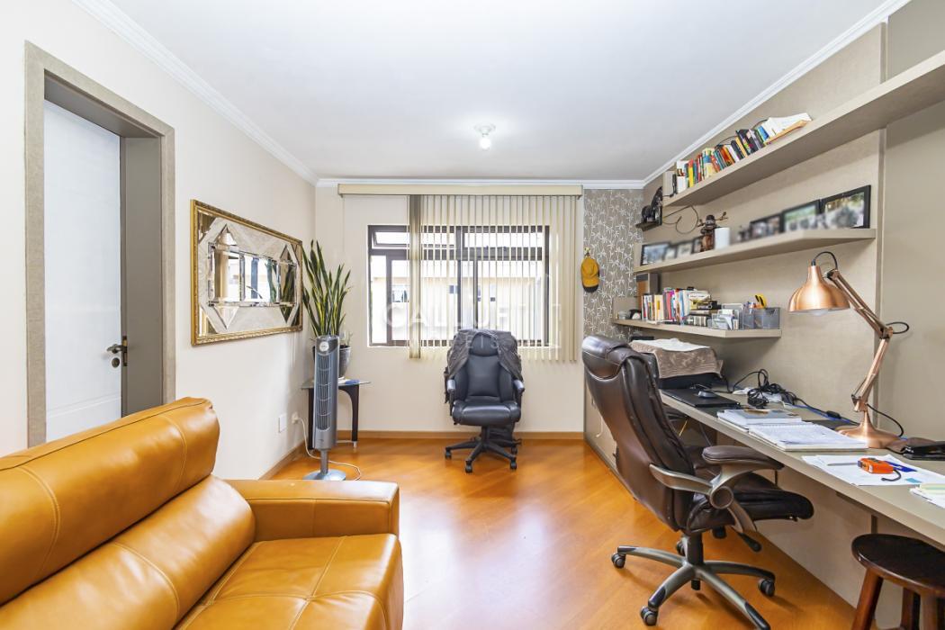 Suíte 3: na configuração atual é utilizada como escritório, piso em madeira, móveis planejados de escritório, papel de parede de alta qualidade.
