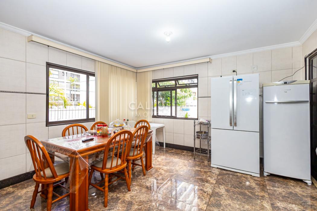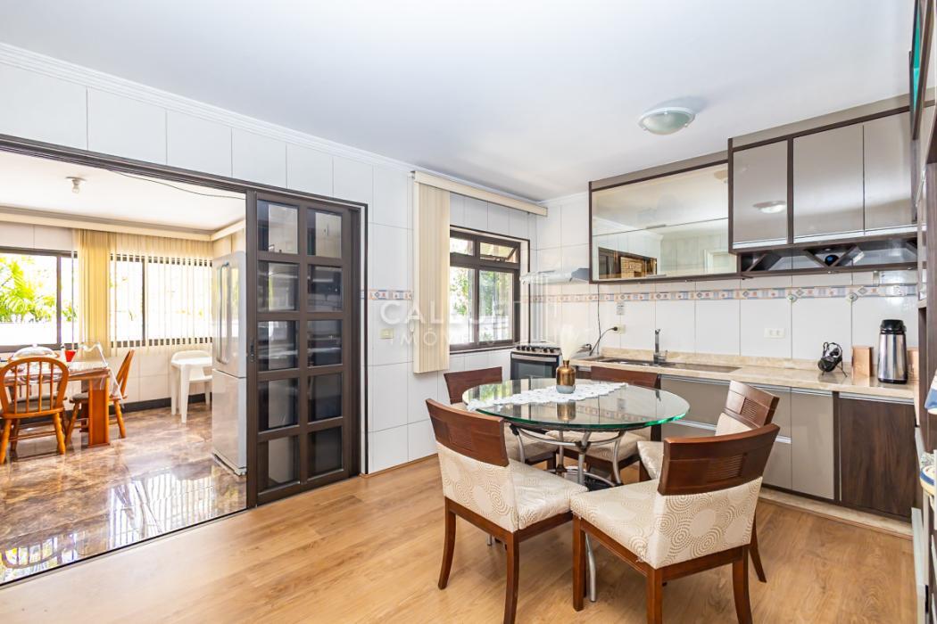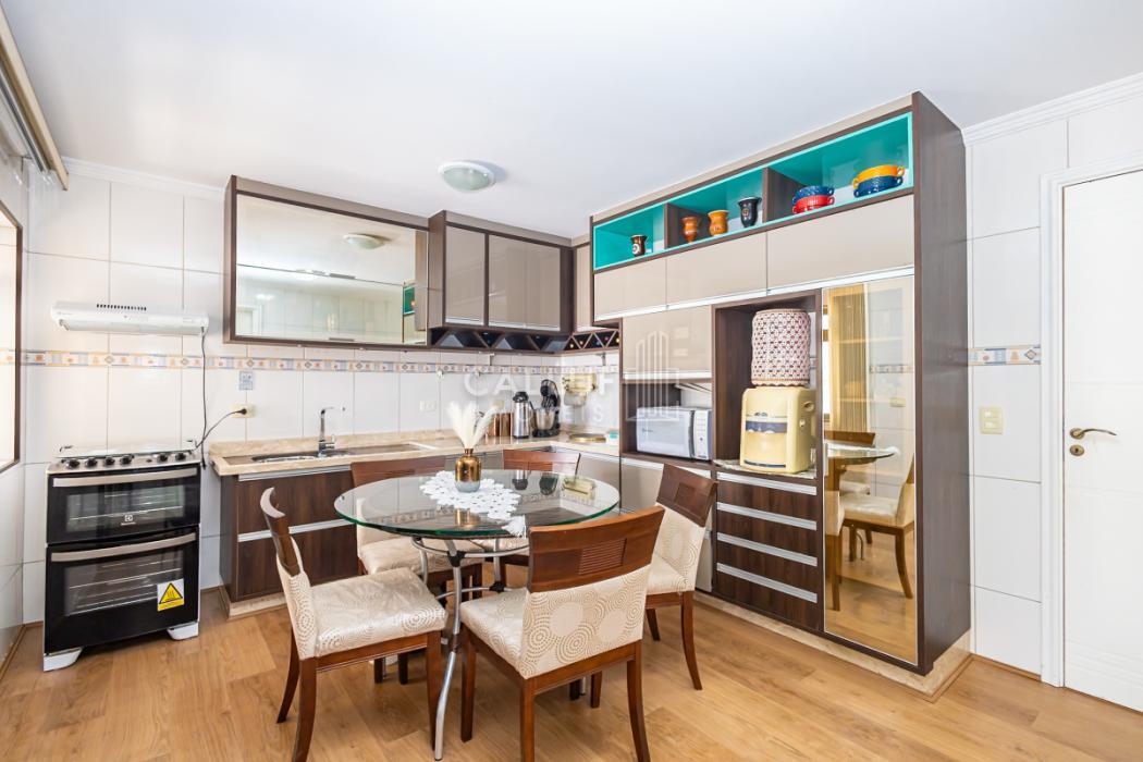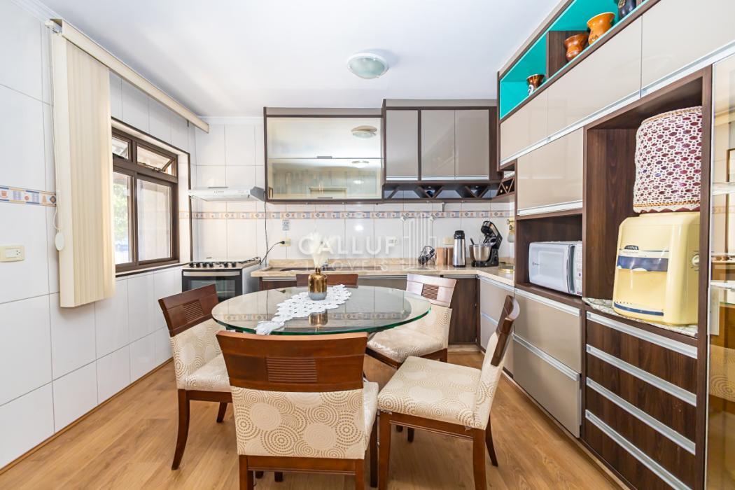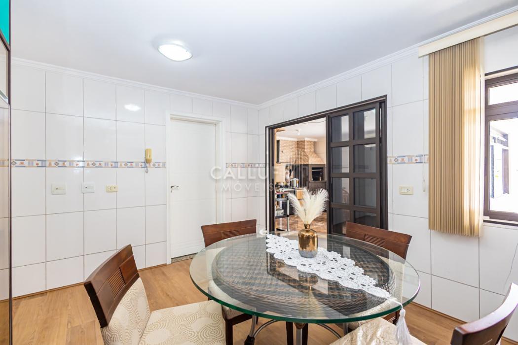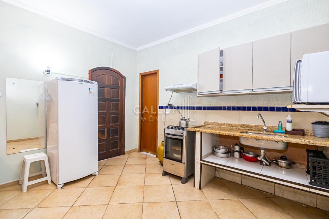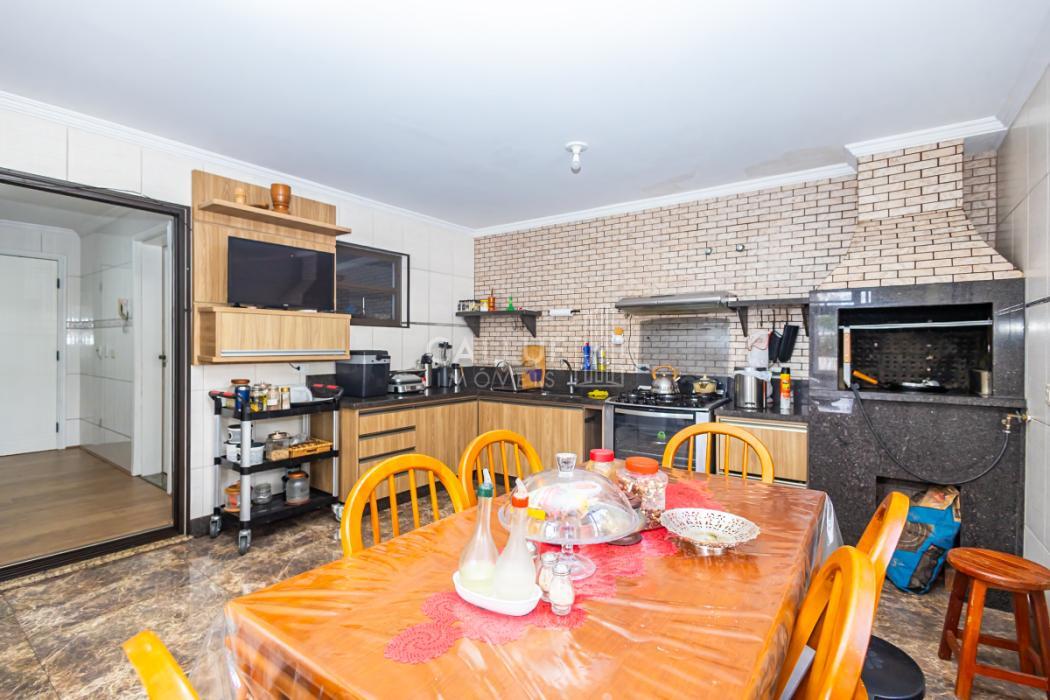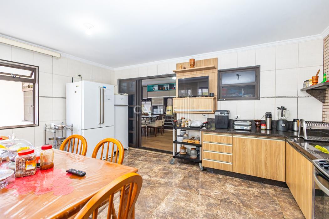 - Ampla cozinha com móveis planejados, arejada e com excelente iluminação natural, piso em porcelanato. Porta de vidro divisória com a área gourmet, porta de madeira dividindo a sala de jantar.