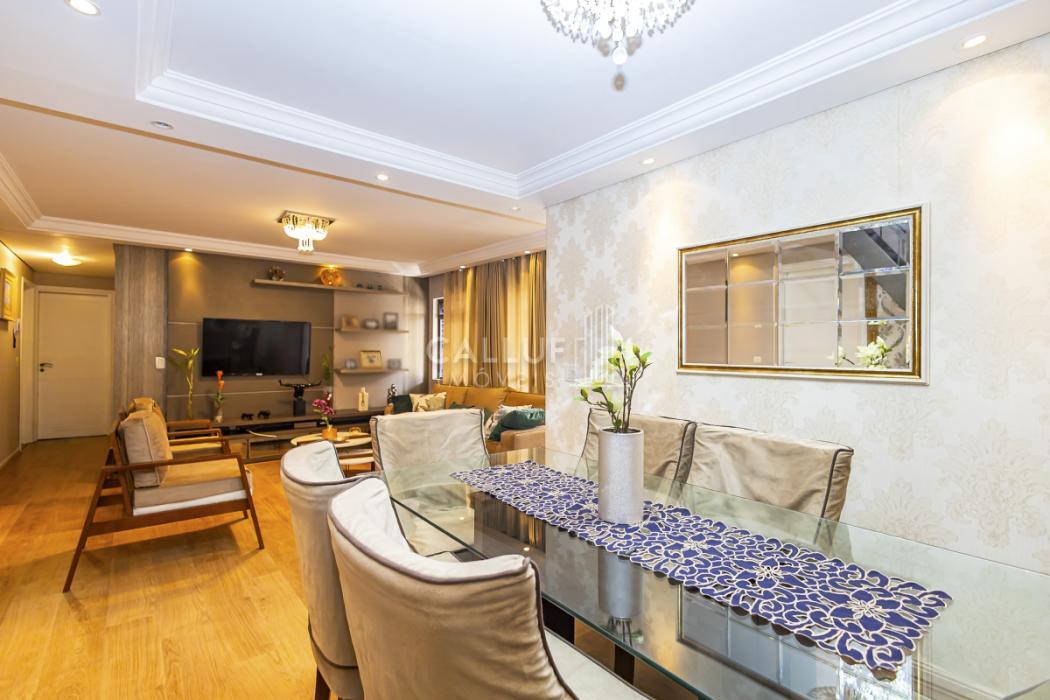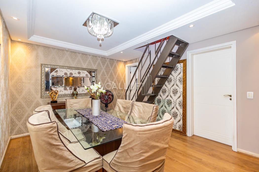- Sala de jantar integrada com a sala de estar. Teto rebaixado em gesso, projeto luminotécnico com spots, decorada com papel de parede de alta qualidade, piso em madeira.