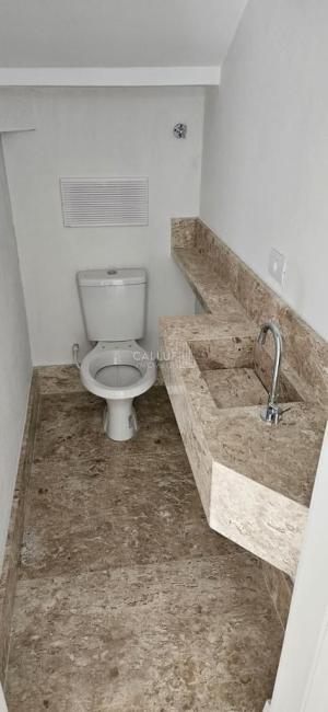 - 04 banheiros, sendo 01 lavabo com pia em mármore travertino no piso inferior e 03 banheiros com tampo em granito nos pisos supeirores.