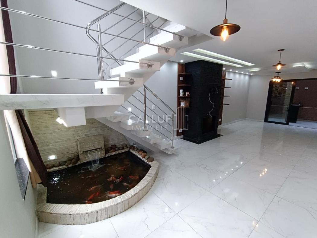 Sala de estar com lareira e fonte decorativa, sala de jantar, lavabo, cozinha planejada, espaço gourmet com teto retrátil automatizado, área de serviço com armários e 2 vagas de garagem.