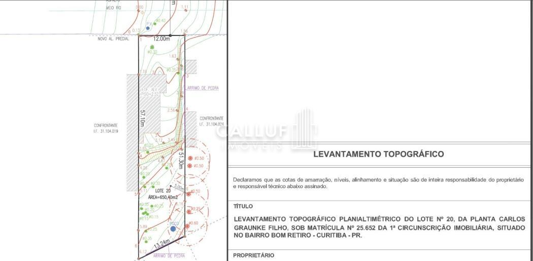 Zoneamento: ZR3.1 - ZONA RESIDENCIAL 3 - LOTE Nº 20 DA PLANTA CARLOS GRAUNKE FILHO DETALHES TÉCNICOSID. FISCAL: 31.104.018TESTADA: 12 METROSLATERAL DIREITA: 57.10 METROSLATERAL ESQUERDA: 51,30 METROSFUNDOS: 13,24 METROS OBSERVAÇÕES:TEMOS PROJETO PARA CONSTRUÇÃO DE CASA / SEDE DE EMPRESA para o terreno;TEMOS O LEVANTAMENTO TOPOGRÁFICO DO TERRENO; DISTANCIAS:CONDOR: 140 METROSCEMITÉRIO MUNICIPAL 1.000 METROSPREFEITURA MUNICIPAL DE CURITIBA 1.100 METROSPALÁCIO IGUAÇÚ: 1.200 METROS CONSULTE-NOS PARA MAIORES INFORMAÇÕES